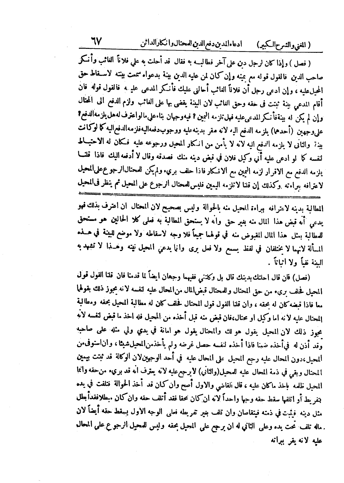 (فصل) فإن قال احلتك بدينك قال بل وكلتني ففيهما وجهان أيضاً لما قدمنا فإن قلنا القول قول المحيل فحلف برئ من حق المحتال وللمحتال قبض المال من المحال عليه لنفسه لأنه يجوز ذلك بقولهما معاً فإذا قفبضه كان له بحقه، وإن قلنا القول قول المححتال فحلف كان له مطالبة المحيل بحقه ومطالبة المحتال عليه لأنه إما وكيل أو محتال، فإن قبض منه قبل أخذه من المحيل فله أخذ ما قبض لنفسه لأنه يجوز ذلك لأن المحيل يقول هو لك والمحتال يقول هو أمانة في يدي ولي مثله على صاحبه وقد أذن له في أخذه ضمناً فإذا أخذه لنفسه حصل غرضه ولم يأخذ من المحيل شيئاً، وإن استوفى من المحيل، دون المحال عليه رجع المحيل على المحال عليه في أحد الوجهين لأن الوكالة قد ثبتت بيمين المحتال وبقي في ذمة المحال عليه للمحيل (والثاني) لا يرجع عليه لأنه يعترف أنه قد برئ من حقه وإنما