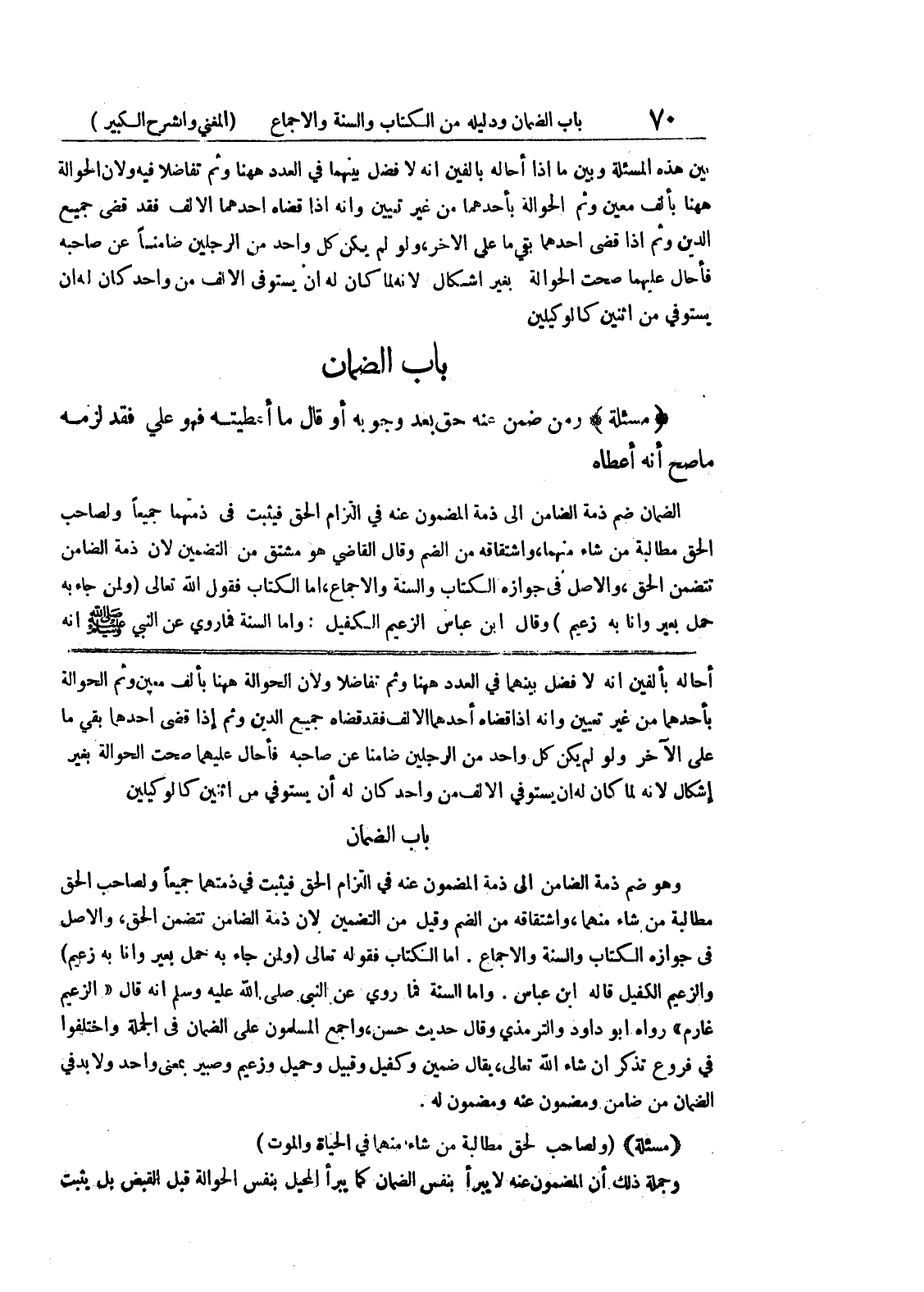 وأما السنة فما روي عن النبي صلى الله عليه وسلم أنه قال (الزعيم غارم) رواه أبو داود والترمذي وقال حديث حسن، وأجمع المسلمون على الضمان في الجملة واختلفوا في فروع تذكر إن شاء الله تعالى، يقال ضمين وكفيل وقبيل وحميل وزعيم وصبير بمعنى واحد ولا بد في الضمان من ضامن ومضمون عنه ومضمون له.