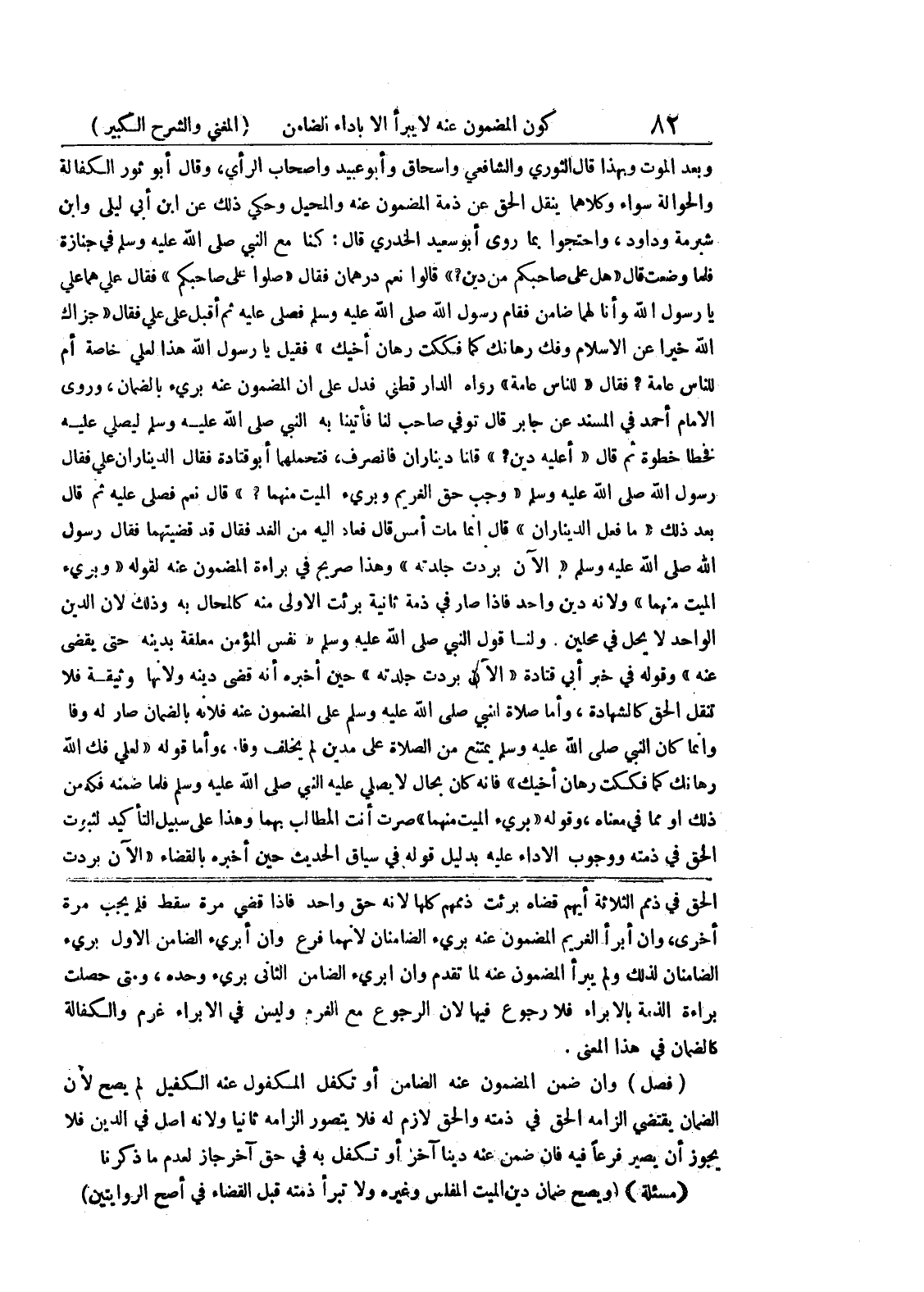 (مسألة) (ويصح ضمان دين الميت المفلس وغيره ولا تبرأ ذمته قبل القضاء في أصح الروايتين)