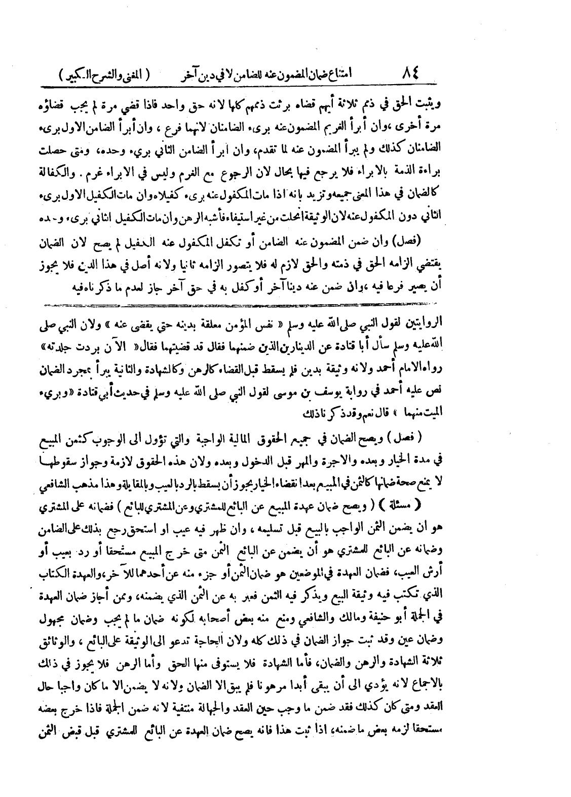 الروايتين لقول النبي صلى الله عليه وسلم (نفس المؤمن معلقة بدينه حتى يقضى عنه) ولأن النبي صلى الله عليه وسلم سأل أبا قتادة عن الدينارين الذين ضمنهما فقال قد قضيتهما فقال (الآن بردت جلدته) رواه الإمام أحمد ولأنه وثيقة بدين فلم يسقط قبل القضاء كالرهن وكالشهادة والثانية يبرأ بمرجد الضمان نص عليه أحمد في رواية يوسف بن موسى لقول النبي صلى الله عليه وسلم في حديث أبي قتادة (وبرئ الميت منهما) قال نعم وقد ذكر نا ذلك (فصل) ويصح الضمان في جميع الحقوق المالية الواجبة والتي تؤول إلى الوجوب كثمن المبيع في مدة الخيار وبعده والأجرة والمهر قبل الدخول وبعده ولأن هذه الحقوق لازمة وجواز سقوطها لا يمنع صحة ضمانها كالثمن في المبيع بعد انقضاء الخيار يجوز أن يسقط بالرد بالعيب وبالمقايلة وهذا مذهب الشافعي (مسألة) (ويصح ضمان عهدة المبيع عن البائع للمشتري وعن المشتري للبائع) فضمانه على المشتري هوان يضمن الثمن الواجب بالبيع قبل تسليمه، وإن ظهر فيه عيب أو استحق رجع بذلك على الضامن