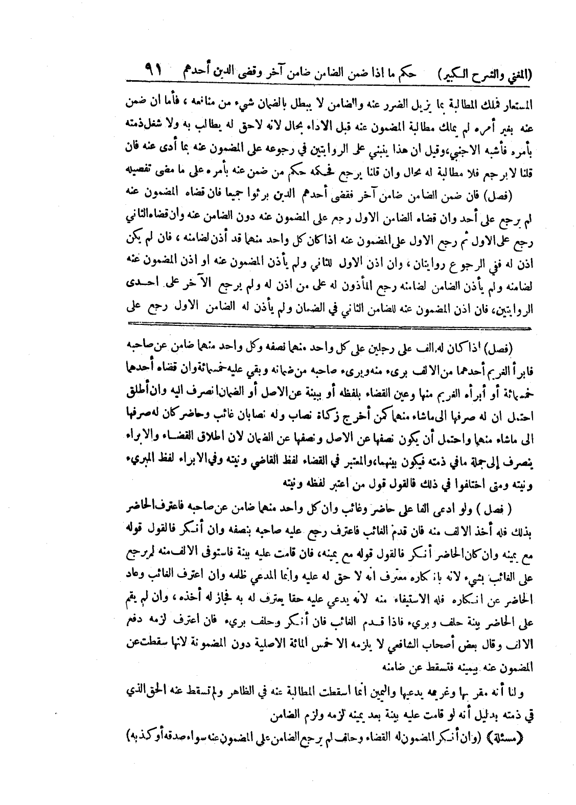 خمسمائة أو أبرأه الغريم منها وعين القضاء بلفظه أو ببينة عن الأصل أو الضمان انصرف إليه وإن أطلق احتمل أن له صرفها الى ما شاء منهما كمن أخرج زكاة نصاب وله نصابان غائب وحاضر كان له صرفها الى ما شاء منهما واحتمال أن يكون نصفها عن الأصل ونصفها عن الضمان لأن إطلاق القضاء والإبراء ينصرف الى جملة ما في ذمته فيكون بينهما، والمعتبر في القضاء لفظ القاضي ونيته وفي الابراء لفظ المبرئ ونيته ومتى اختلفوا في ذلك فالقول قول من اعتبر لفظه ونيته (فصل) ولو ادعى ألفا على حاضر وغائب وإن كل واحد منهما ضامن عن صاحبه فاعترف الحاضر بذلك فله أخذ الألف منه فإن قدم الغائب فاعترف رجع عليه صاحبه بنصفه وإن أنكر فالقول قوله مع يمينه وإن كان الحاضر أنكر فالقول قوله مع يمينه، فإن قامت عليه بينة فاستوفى الألف منه لم يرجع على الغائب بشئ لأنه بإنكاره معترف أنه لا حق له عليه وإنما المدعي ظلمه وإن اعترف الغائب وعاد الحاضر عن إنكاره فله الإستيفاء منه لأنه يدعي عليه حقاً يعترف له به فجاز له أخذه، وإن لم يقم على الحاضر بينة حلف وبرئ فإذا قدم الغائب فإن أنكر وحلف برئ فإن اعترف لزمه دفع الألف وقال بعض أصحاب الشافعي لا يلزمه إلا خمس المائة الاصيلة دون المضمونة لأنها سقطت عن المضمون عنه بيمينه فتسقط عن ضامنه ولنا أنه مقربها وغريمه يدعيها واليمين انما أسقطت المطالبة عنه في الظاهر ولم تسقط عنه الحق الذي في ذمته بدليل أنه لو قامت عليه بينة بعد يمينه لزمه ولزم الضامن (مسألة) (وإن أنكر المضمون له القضاء وحلف لم يرجع الضامن على المضمون عنه سواء صدقه أو كذبه)