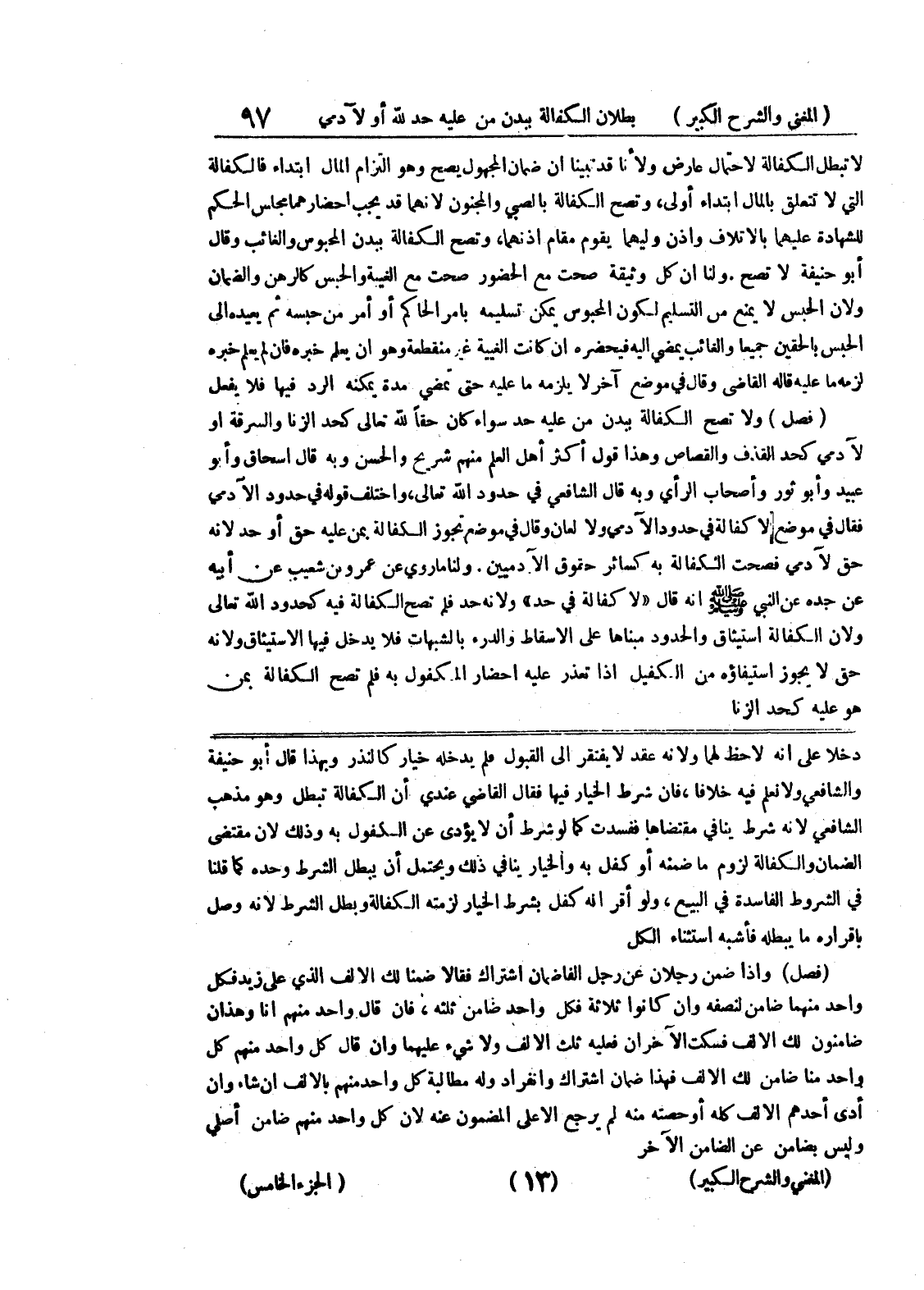 والشافعي ولا نعلم فيه خلافاً، فإن شرط الخيار فيها فقال القاضي عندي أن الكفالة تبطل وهو مذهب الشافعي لأنه شرط ينافي مقتضاها ففسدت كمما لو شرط أن لا يؤدي عن الكفول به وذلك لأن مقتضى الضمان والكفالة لزوم ما ضمنه أو كفل به والخيار ينافي ذلك ويحتمل أن يبطل الشرط وحده كما قلنا في الشروط الفاسدة في البيع وولو أقرانه كفل بشرط الخيار لزمته الكفالة وبطل الشرط لأنه وصل بإقراره ما يبطله فأشبه استثناء الكل (فصل) وإذا ضمن رجلان عن رجل الفاضمان اشتراك فقالا ضمنا لك الألف الذي على زيد فكل واحد منهما ضامن لنصفه وإن كانوا ثلاثة فكل واحد ضامن ثلثه، فإن قال واحد منهم أنا وهذان ضامنون لكل الألف فسكت الآخران فعليه ثلث الألف ولا شئ عليهما وإن قال كل واحد منهم كل واحد منا ضامن لك الألف فهذا ضمان اشتراك وانفراد وله مطالبة كل وحد منهم بالألف إن شاء وإن أدى أحدهم الألف كله أو حصته منه لم يرجع الاعلى المضمون عنه لأن كل واحد منهم ضامن أصلي وليس بضامن عن الضامن الآخر