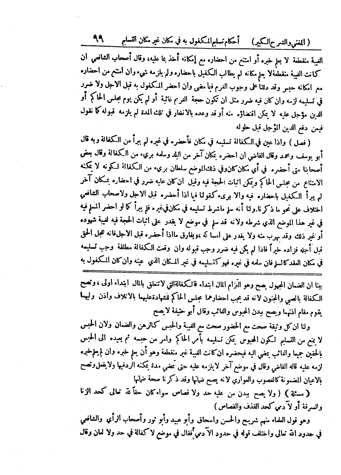ببنا أن الضمان المجهول يصح وهو التزام المال ابتداء فالكفالة التي لا تتعلق بالمال ابتداء أولى، وتصح الكفالة بالصبي والمجنون لأنه قد يجب إحضارهما مجلس الحاكم للشهادة عليهما بالاتلاف واذن وليعما يقوم مقام إذنهما ويصح ببدن المحبوس والغائب وقال أبو حنيفة لا يصح ولنا أن كل وثيقة صحت مع الحضور صحت مع الغيبة والحبس كالرهن والضمان ولأن الحبس لا يمنع من التسليم لكون المحبوس يمكن تسليمه بأمر الحاكم وأمر من حبسه ثم يعيده الى الحبس بالحقين جميعاً والغائب يمضي اليه فيحضره إن كانت الغيبة غير منقطعة وهو أن يعلم خبره وإن لم يعلم خبره لزمه عليه قاله القاضي وقال في موضع آخر لا يلزمه عليه حتى تمضي مدة يمكنه الرد فيها ولا يفعل وتصح بالأعيان المضمونة كالغصوب والعواري لأنه يصح ضمانها وقد ذكرنا صحة ضمانها (مسألة) (ولا يصح ببدن من عليه حد ولا قصاص سواء كان حقاً لله تعالى كحد الزنا والسرقة أو لآدمي كحد القذف والقصاص) وهو قول العلماء منهم شريح والحسن واسحاق وأبو عبيد وأبو ثور وأصحاب الرأي والشافعي في حدود الله تعالى واختلف قوله في حدود الآدمي فقال في موضع لا كفالة في حد ولا لعان وقال