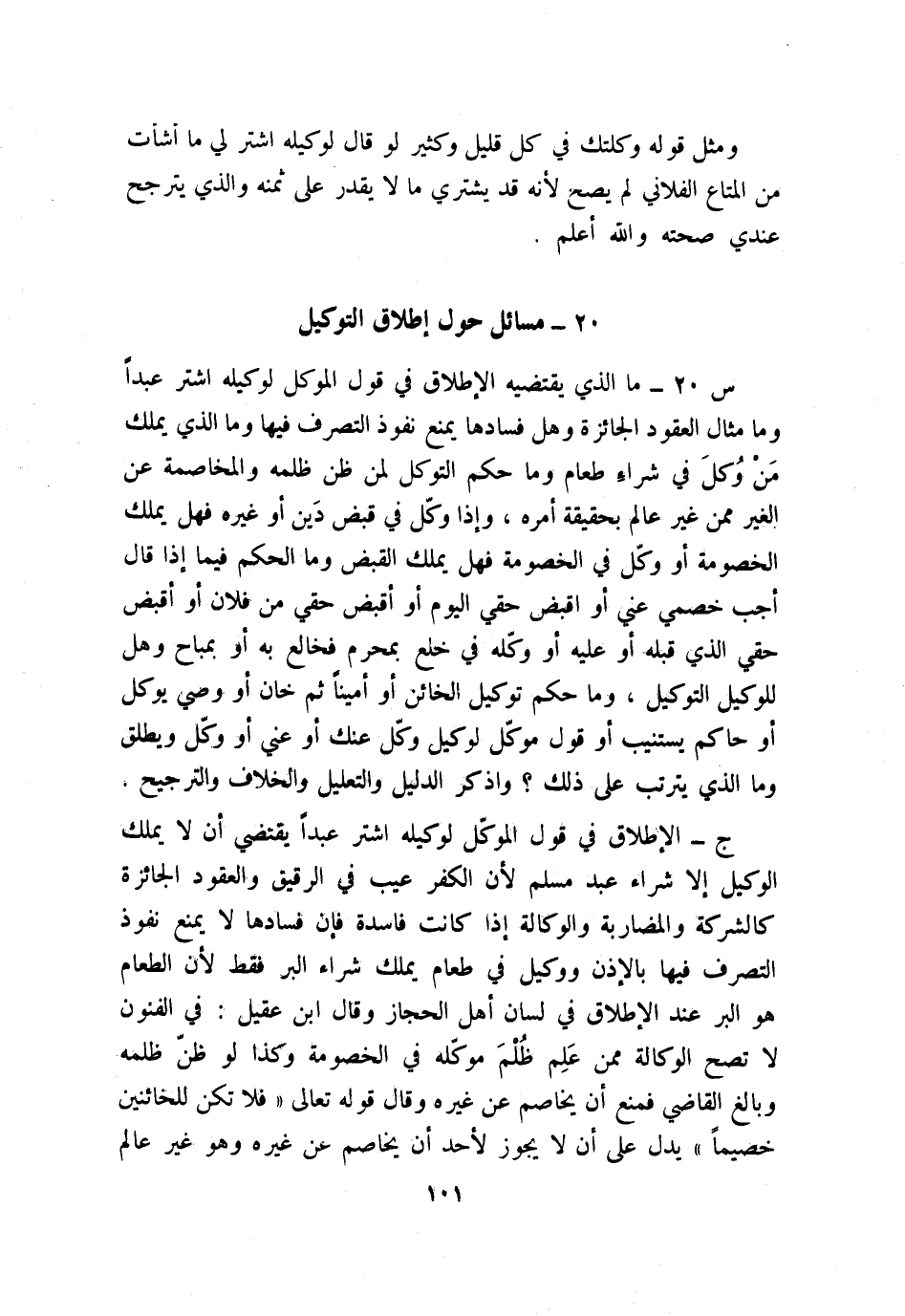 س20: ما الذي يقتضيه الإطلاق في قول الموكل لوكيله: اشتر عبدًا؟ وما مثال العقود الجائز؟ وهل فسادها يمنع نفوذ التصرف فيها؟ وما الذي يملك مَنْ وُكلَ في شراء طعام؟ وما حكم التوكل لمن ظن ظلمه والمخاصمة عن الغير ممن غير عالم بحقيقة أمره، وإذا وكّل في قبض دين أو غيره، فهل يملك الخصومة أو وكّل في الخصومة؟ فهل يملك القبض؟ وما الحكم فيما إذا قال: أجب خصمي عني أو اقبض حقي اليوم أو أقبض حقي من فلان أو أقبض حقي الذي قبله أو عليه أو وكّله في خلع بمحرم فخالع به أو بمباح؟ وهل للوكيل التوكيل؟ وما حكم توكيل الخائن أو أمينًا ثم خان أو وصي يوكل أو حاكم يستنيب أو قول موكّل لوكيل: وكّل عنك أو عني أو وكّل ويطلق؟ وما الذي يترتب على ذلك؟ واذكر الدليل والتعليل والخلاف والترجيح.