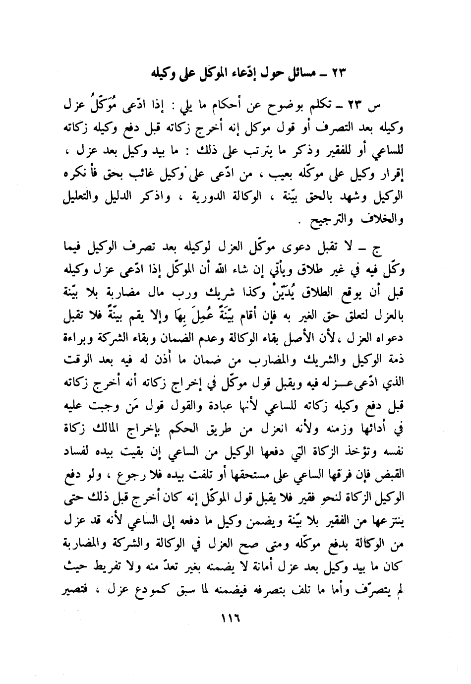 س23: تكلم بوضوح عن أحكام ما يلي: إذا ادّعى موكل عزل وكيله بعد الترف أو قول موكل إنه أخرج زكاته قبل دفع وكيله زكاته للساعي أو للفقير، وذكر ما يترتب على ذلك: ما بيد وكيل بعد عزل، إقرار وكيل على موكله بعيب، من ادّعى على وكيل غائب بحق فأنكره الوكيل وشهد بالحق بيّنة، الوكالة الدورية، واذكر الدليل والتعليل والخلاف والترجيح.