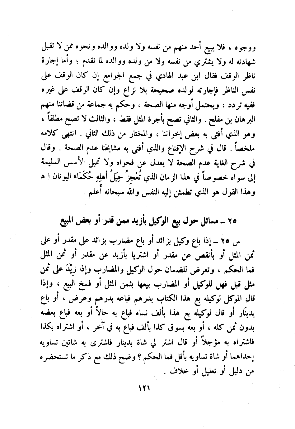 س25: إذا باع وكيل بزائد أو باع مضارب بزائد على مقدر أو على ثمن المثل أو بأنقص عن مقدر أو اشتريا بأزيد عن مقدر أو ثمن المثل، فما الحكم؟ وتعرض للضمان حول الوكيل والمضارب إذا زِيْدَ على ثمن مثل قبل فهل للوكيل أو المضارب بيعها بثمن المثل أو فسخ البيع، وإذا قال الموكل لوكيله: بع هذا الكتاب بدرهم فباعه بدرهم وعرض، أو باع بدينار، أو قال لوكيله: بع هذا بألف نساء فباع به حالًا أو بعه فباع بعضه بدون ثمن كله، أو بعه بسوق كذا بألف فباع به في آخر، أو اشتراه بكذا فاشتراه به مؤجلًا، أو قال: اشتر لي شاة بدينار فاشترى به شاتين تساويه إحداهما أو شاة تساويه بأقل، فما الحكم؟ وضح ذلك مع ذكر ما تستحضره من دليل أو تعليل أو خلاف.