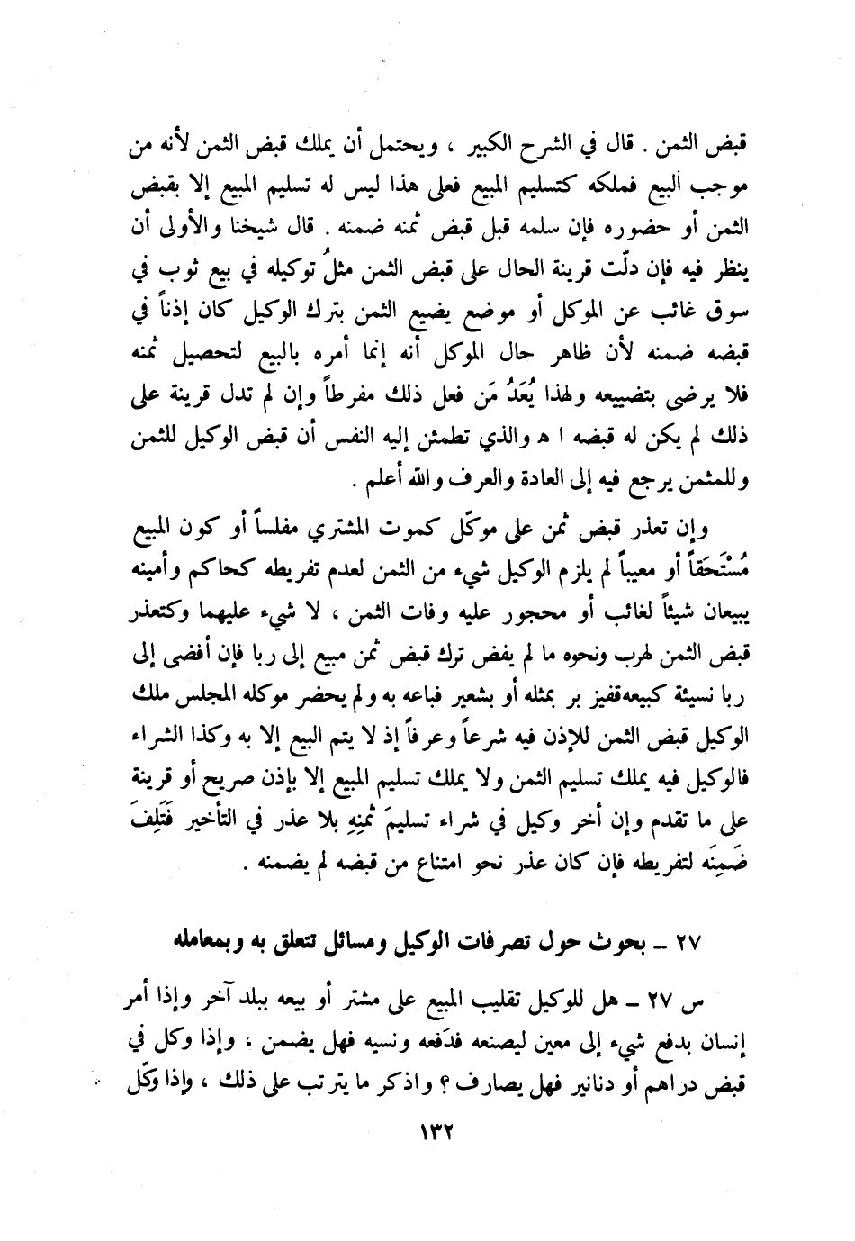ج: ليس لوكيل في بيع تقليب المبيع على مشتر إلا بحضرة موكّل؛ لأن الإذن في البيع لا يتناوله؛ فإن حضر الموكّل جاز لدلالة الحال على رضاه به، وإلا بأن دفعه إليه ليقلبه بحيث يغيب به عن الوكيل فأخذه ليريه أهله ضمن الوكيل لتعديه، وفي «الفروع» : ويتوجه العرف. اهـ. وهذا هو الذي تطمئن إليه النفس. والله أعلم.