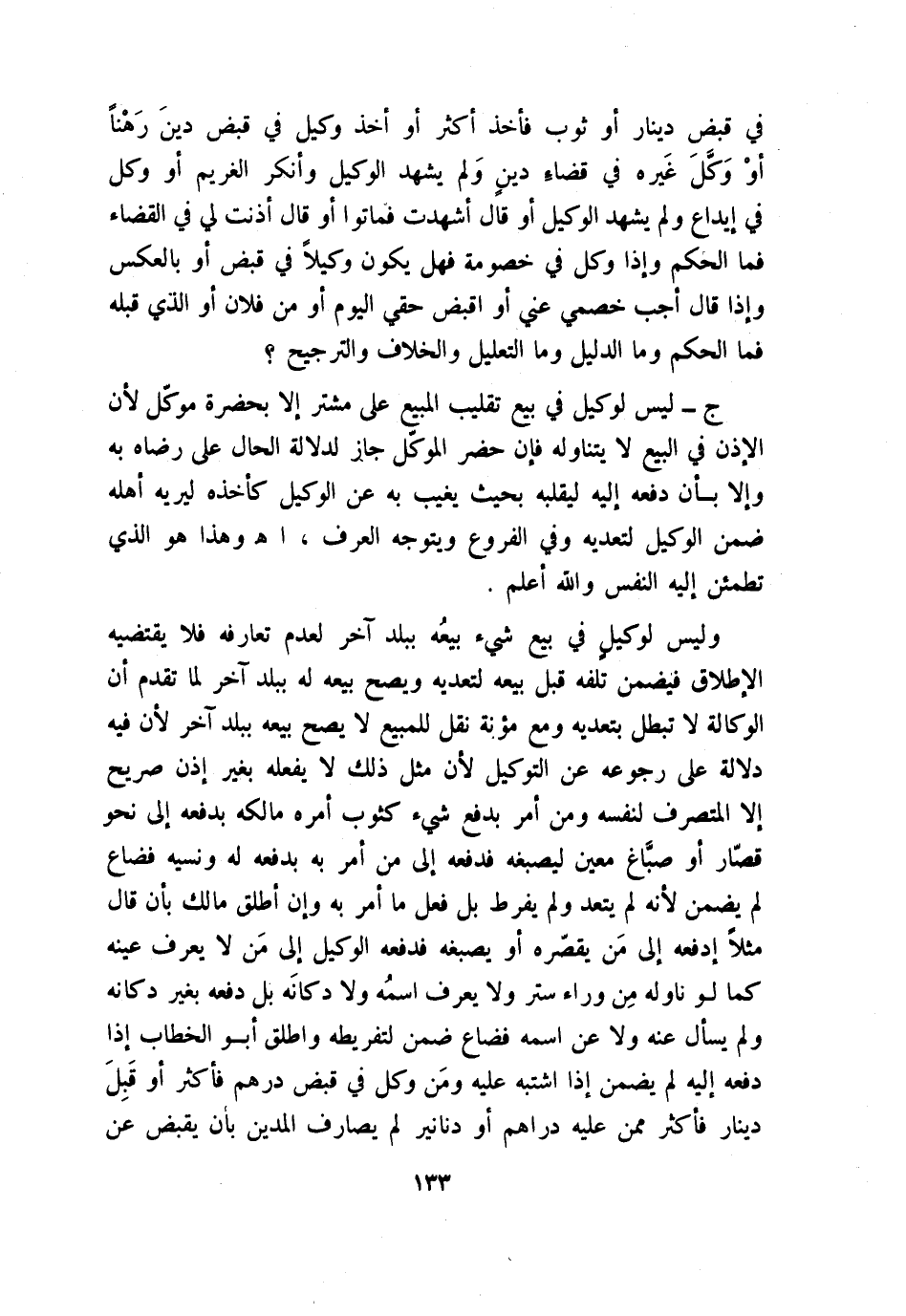الدنانير دراهم أو عن الدراهم دنانير؛ لأن لم يأمره بمصارفته ويكون من ضمان الباعث إن تلف؛ لأنه دفع إلى الرسول غير ما أمِرَ به، فهو وكيل للدافع في تأديته إلى صاحب الدين إلا إن أخبر الرسول المدين أن ربّ الدين أذنهُ في ذلك فيكون من ضمان الرسول؛ لأنه غرّه. قال الشيخ عثمان: ولا يعارض هذا ما سبق في الضمان من أن الرسول المخالف يكون ضمان ما خالف فيه على المرسل الأول، ويستقر على الرسول؛ لأن ذلك فيما إذا كان المأمور بقبضه عين مال المرسل كالوديعة، بخلاف ما هنا؛ فإنه في الدين وهو لا يملك إلا بقبضه، وسوى في «الإقناع» بين المسألتين، فجعل الضمان على الباعث، أي المدين، أو من عنده المال، ويرجع على الرسول في الأخيرة، أي صورة الوديعة، وإن أخذ وكيل في قبض دين رهنًا أساء بأخذه؛ لأنه غير مأذون فيه ولم يضمن الرهن وكيل؛ لأنه رهن فاسد، وفاسد العقود كصحيحها في الضمان وعدمه، ومن وكل غيره لو كان الوكيل مودعًا في قضاء دين فقضاه، ولم يشهد الوكيل بالقضاء، وأنكر غريم القضاء لم يقبل قول وكيل عليه؛ لأنه لم يأتمنه، وكما لو ادعاه الموكل وضمن وكيل لموكله ما أنكره رب الدين لتفريطه بترك الإشهاد، ولهذا إنما ضمن ما ليس بحضرة موكل، وقيل: يتبع العرف والعوائد تختلف بحسب الديون وحسب الغرماء فمن كان دينه مؤجلًا بوثيقة ووكل المدين من يقضيه دين ثم قضاه بلا إشهاد عليه، فهذا مفرط والمفرط ضامن؛ لأنه مأمور بقضاء مبرئ للذمة؛ وأما إن كان عنده طلب الآخر بلا وثيقة ولم يأمره بالإشهاد، بل أمره أن يعطيه حقه، والمقضي أمين، فهذا لا يعده الناس مفرطًا فلا ضمان عليه إن لم يشهد؛ فإن حضر مع ترك الإشهاد فقد رضي بفعل وكيله، كقوله: اقضه، ولا تشهد بخلاف حال غيبته لا يقال هُوَ لم يأمره بالإشهاد فلا يكون مفرطًا بتركه؛ لأنه إنما أذنه في قضاء مبرئ ولم يفعل، ولهذا يضمن ولو صدقه موكل
