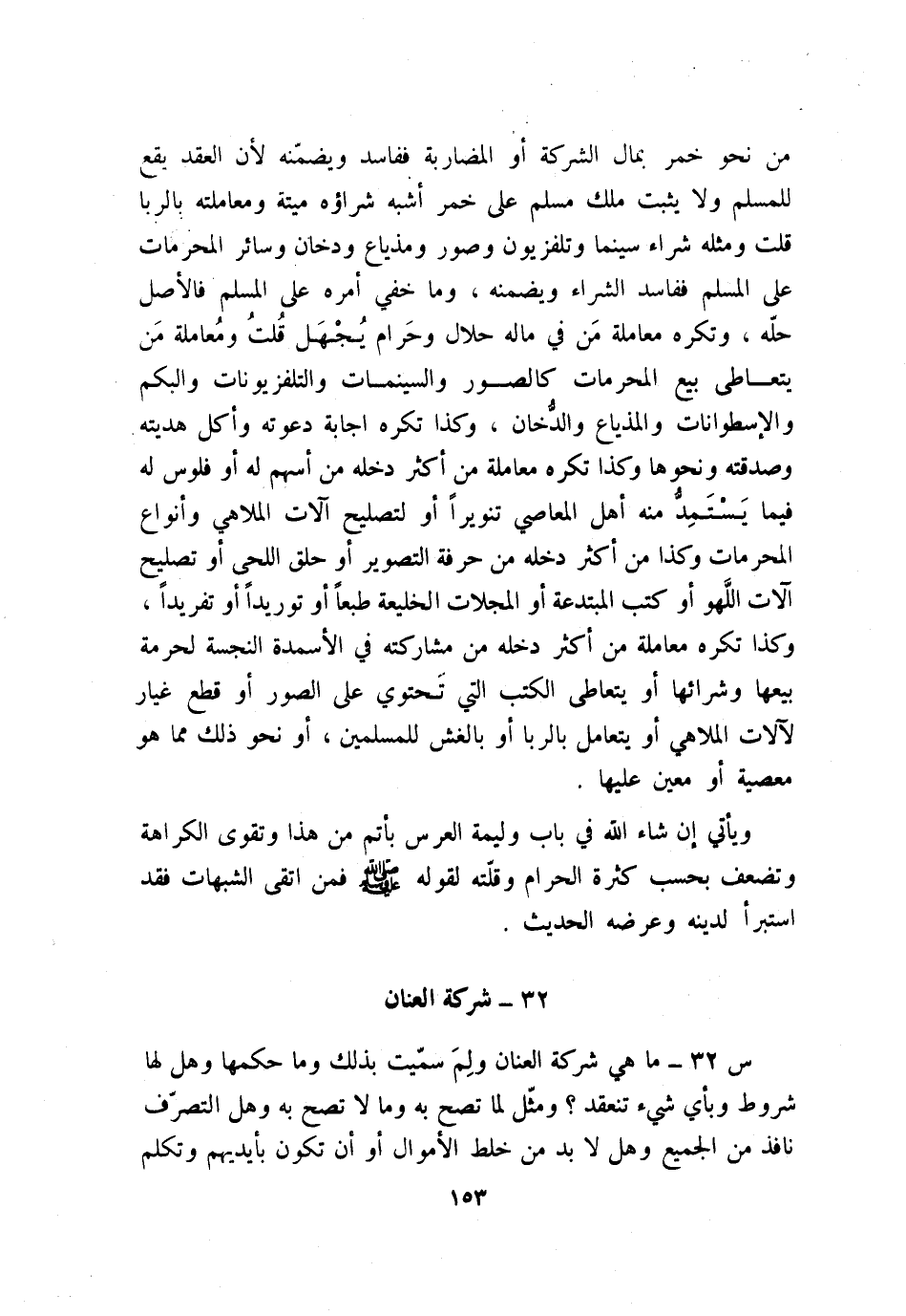 وشروطها أربعة: فشركة العِنَان أن يُحْضِرُ كُل واحد من عدد اثنين فأكثر جائز التصرف فلا تعقد على ما في الذمة ولا مع صغير ولا سفيه من ماله فلا تعقد بنحو مغصوب ويحضرا نقدًا ذهبًا أو فضة مضروبًا أي مسكوكًا معلومًا قدرًا وصفةً ولو كان النقد مغشوشًا قليلًا لِعُسْر التحرز منه لا كثيرًا، أو كان النقدين من جنسين كذهب وفضة أو كان متفاوتًا بأن أحضر أحدهما مائة والآخر مائتين أو كان شائعًا بين الشركاء إن علم كل منهم قدر ماله كما لو ورّثوه لأحدهم النصف ولآخر الثلث ولآخر السدس واشتركوا فيه قبل قسمته.