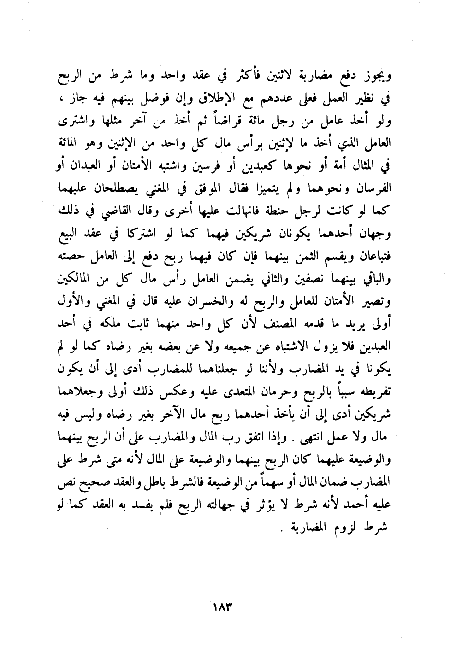 وقال ابن القيم والشيخ تقي الدين: أو عادة؛ لأن النفقة تخصه فكانت عليه كنفقة الحضر وأجر الطبيب وثمن التطبيب؛ لأنه داخل على أنه لا يستحق من الربح إلا الجزء المسمى، فلا يكون له غيره؛ ولأنه لو استحق النفقة أفْضى إلى أن يختص بالربح إذا لم يربح سوى النفقة، وبهذا قال ابن سيرين وحماد ابن أبي سليمان، وهو ظاهر مذهب الشافعي، وقال الحسن والنخعي والأوزاعي ومالك وإسحاق وأبو ثور وأصحاب الرأي: يُنفق من المال بالمعروف إذا شخص به عن البلد؛ لأن سفره لأجل المال فكانت نفقته فيه كأجر الحمَّال، والقول الأول هو الذي تطمئن إليه النفس. والله أعلم.