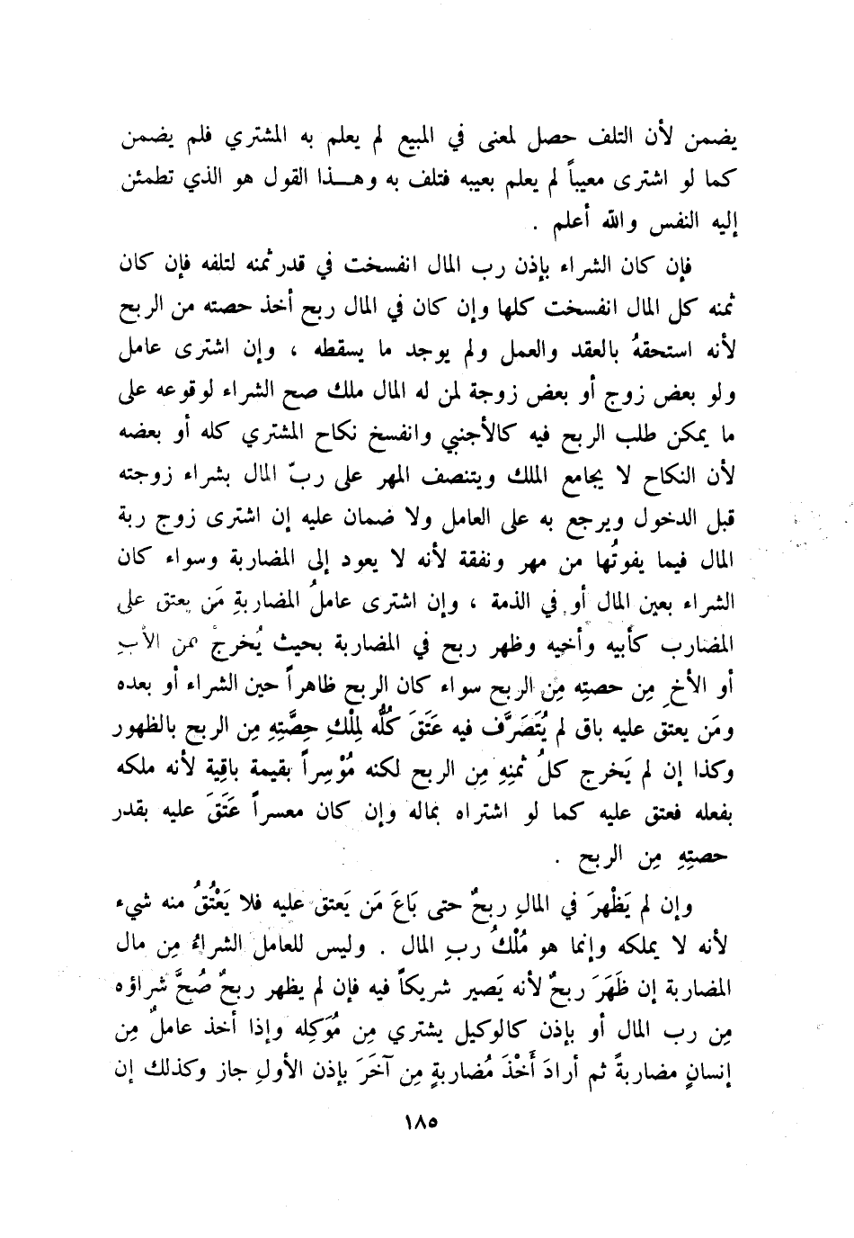 قُومتْ به فهو شُبْهَةٌ في درء الحد وإن لم يظهر ربح، وعليه المهر إن لم يطأ بإذن رب المال وإن ولدت منه وظهر ربح صارت أم ولد وولده حر، وعليه قيمتها وإن لم يظهر فهي وولدها لرب المال، ولا يطأ رب المال أمة من المضاربة ولو عدم الربح؛ لأنه ينقصها إن كانت بكرًا أو يعرضها للتلف والخروج من المضاربة ولا حدَّ عليه؛ لأنها ملكه وإن ولدتع منه خرجت من المضاربة وحُسبتْ قيمتُها عليه؛ فإن كان فيه ربحٌ فللعامل منه حصتُه ولا ربح لعاملٍ حتى يُستوفي رأسُ المال؛ لأن الربح هو الفاضلُ من رأس المال وما لم يفضل فليس بربح والوضيعة الخسارة والناضُّ من المال ما تحول عينًا بعد ما كان متاعًا، ويقال: ما نضَّ بيده شيء، وفي حديث ابن عمر - رضي الله عنهما -: «كان يأخذ الزكاة من ناض المال هو ما كان ذهبًا أو فضة عينًا أو ورقًا» ، وفي الحديث الآخر: «خذ صدقة ما قد نضَّ مِن أموالهم» . ووصف رجل بكثرة المال، فقيل: أكثر الناس ناضًا ونضا الثياب ينضوها نضوًا إذا خلعها. قال امرؤ القيس: