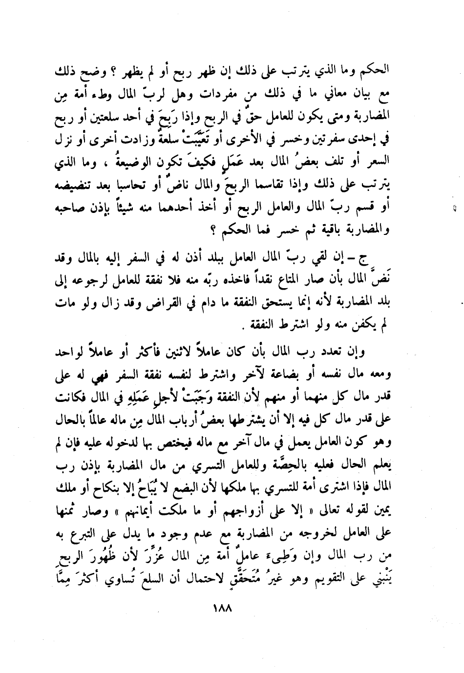 القبض وإن أتلف العاملُ مال المضاربة ثم نقد الثمن من مالِ نفسِه بلا إذن ربّ المال لم يرجع ربُ المال على العامل بشيء، والعامل باق على المضاربة؛ لأنه لم يتعد فيه وإن قُتِل قنُّ المضاربة عمدًا فلرب المال أن يقتص بشرط؛ لأنه مالك المقتول وتبطل المضاربة فيه لذهاب رأس المال، وله العفو على مال ويكون المال المعفو عليه كبدل المبيع، وهو ثمنه؛ لأنه عوضٌ عنه، والزيادة في المال المعفو عليه على قيمة المقتول ربحٌ في المضاربة ومع ربح بأن كان ظهر ربح في المضاربة وقُتل قُّنها عمدًا، فالقودُ إلى ربّ المال والعامل كالمصلحة؛ لأنهما صارا شريكين بظهور الربح، ويملك عاملٌ حصته مِن ربحٍ بمجرد ظهوره قبل قسمته كمالك المال، وكما في المساقاة والمزارعة؛ لأن الشرط صحيح فيثبت مقتضاه، وهو أن يكون له جزء من الربح، فإذا وجد وجب أن يملكه، وأيضًا فهذا الجزء مملوك، ولابد له من مالك وربّ المال لا يملكه اتفاقًا فلزم أن يكون للمضارب ولملكه الطلب بالقسمة ولا يمتنع أن يملكه ويكون وقاية لرأس المال كنصيب ربّ المال من الربح ولو لم يعمل المضارب، إلا أنه صرف الذهب بورق فارتفع الصرف استحقه، ولا يملك المضارب الأخذ من الربح إلا بإذن رب المال؛ لأن نصيبه مشاع فلا يقاسم نفسه؛ ولأن ملكه له غير مستقر وإن شرط أنه لا يملكه إلا بالقسمة لم يصح الشرط لمنافاته مقتضى العقد وتحرم قسمة الربح وعقد المضاربة باقٍ إلا باتفاقهما؛ لأن وقاية لرأس المال فلا يجبر ربه على القسمة؛ لأنه لا يأمن الخسران فيجبره بالربح ولا العامل؛ لأنه لا يأمن أن يلزمه ما أخذه في وقت لا يقدر عليه؛ فإن اتفقا على قسمته أو بعضه جاز؛ لأنه ملكها كالشريكين، وإن أبى مالك البيع بعد فسخ المضاربة والمال عرض وطلبه عامل أجبر رب المال عليه إن كان فيه ربح؛ لأن حق العامل في الربح لا يظهر إلا بالبيع فأجبر الممتنع لتوفيته كسائر الحقوق؛ فإن لم يظهر ربح لم يجبر مالك على بيع؛ لأنه