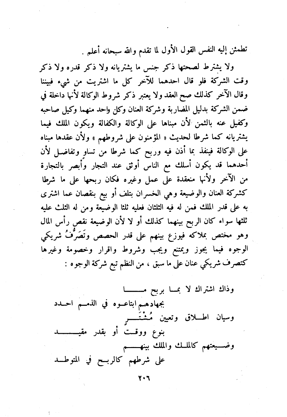 الأجرة، ويرجع كل واحد منهم على رفقته الثلاثة لتفاوت قدر العمل بثلاثة أرباع أجر المثل فيرجع رب الدابة على رفقته الثلاثة بثلاثة أرباع أجرة مثلها وهكذا، ويسقط الربع الرابع؛ لأنه في مقابلة ما لزمه من العمل، فلو كانت أجرة مثل الدابة أربعين، والرحى ثلاثين، والدكان عشرين، وعمل العامل عشرة؛ فإن ربَّ الدابة يرجع على الثلاثة بثلاثة أرباع أجرتها وهي ثلاثون مع ربع أجرتها الذي لا يُرجعُ به على أحدِ وهو عشرة فيكمل له أربعون، ويرجع رب الرحى على الثلاثة باثنين وعشرين ونصف مع ما لا يرجع به وهو سبعة ونصف فيكمل له ثلاثون، ويرجع رب الدكان بخمسة عشر مع ما لا يرجع به وهو خمسة فيكمل له عشرون، ويرجع العامل بسبعة ونصف مع ما لا يرجع به وهو درهمان ونصف، فيكمل له عشرة ومجموع ذلك مائة درهم وهي القدر الذي استؤجروا به، وإنما لم يرجع بالربع الرابع؛ لأن كل واحد منهم قد لزمه ربع الطحين بمقتضى الإجازة، فلا يرجع بما لزمه على أحد ولو تولى أحدهما الإجارة لنفسه كانت الأجرة كلها له، وعليه لكل واحد من رفقته أجرة ما كان من جهته، ومن قال لآخر: آجر عبدي أو أجر دابتي والأجرة بيننا، ففعل، فالأجرة لرب العبد والدابة وللمؤجر أجرة مثله؛ لأنه عمل بعوض لم يسلم له، والذي تطمئن إليه النفس أنه إذا كان عن رضى وصحة عقل يكون على ما شرطا يؤيده حديث: «المؤمنون على شروطهم» والله سبحانه وتعالى أعلم. ويصح جمع بين شركة عنان وأبدان ووجوه ومضاربة لصحة كل منها منفردة، فصحت مع غيرها ومُوجب العقد في شركة وجعالة وإجارة التساوي في عمل وأجر؛ لأنه لا مرجح لأحدهم يستحق به الفضل، ولذي زيادة عمل لم يتبرع بالزيادة طلبها من رفيقه ليحصل التساوي.