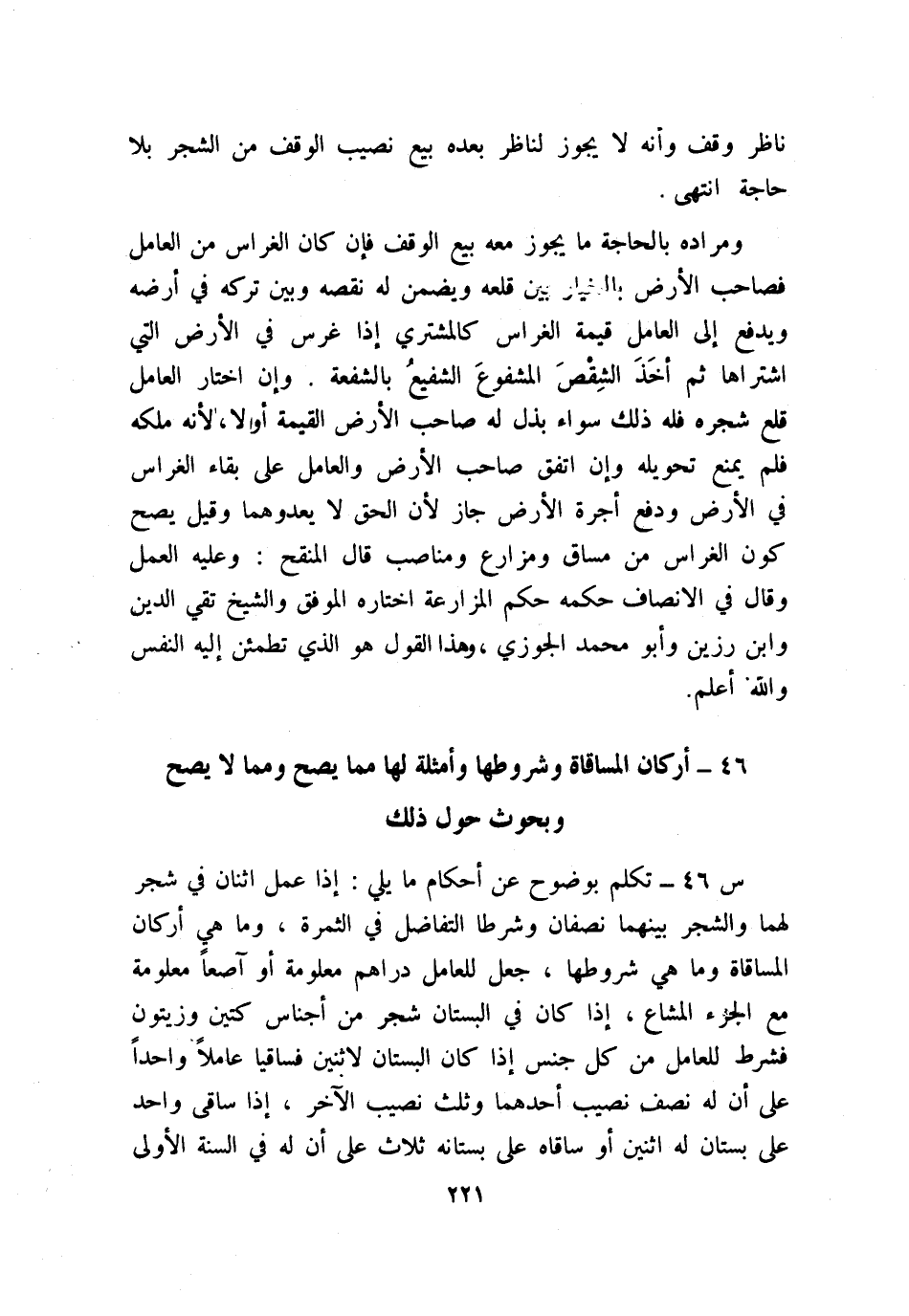 ج: على عامل في المساقاة والمغارسة والمزارعة عند إطلاق العقد كل ما فيه نمو أو صلاح الثمر وزَرْعٍ من سقي بماء حاصل لا يحتاج إلى حفر بئر ولا إدارة دولاب وإصلاح طرق الماء بتنقية مجراه من طين وغيره وإصلاح محله بتسوية ما ارتفع من الأرض مع ما انخفض منها لتشرب العروق وتستوفي حظها من الماء وتشميسُ ما يحتاج إلى تشميس وإصلاح موضع الشمس وحرث وآلته وبقره وزبار وهو تخفيف الكرم من الأغصان الرّديئة وبعض الجيدة بقطعها بمنجل ونحوه، وتلقيح وهو جعل طلع الفحال في طلع التمر وقطع حشيش مضر بشجر أو زرع وقطع شوك وشجر يبس وآلة قطع كفأس ومنجل وتفريق زبل وتفريق سباخ، وهو ما يجمع من الأزقة