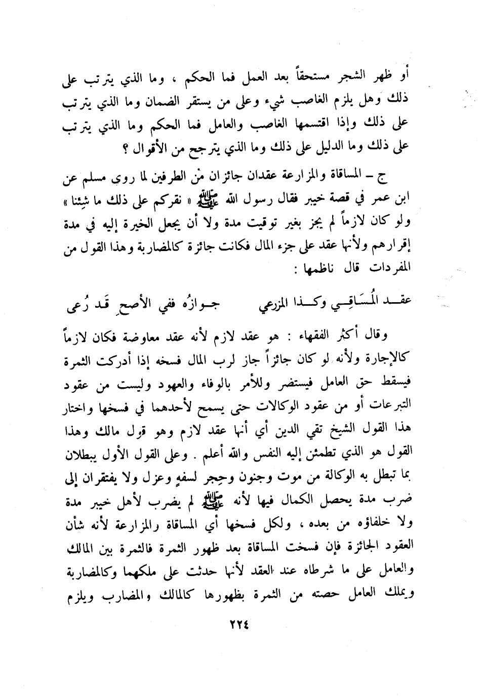 يؤخذ لا محالة وامتنع بجاه أو رشوة أو غيرهما كان قد ظلمَ من يؤخذ منه القسط الذي يخصه، وليس هذا بمنزلة أن يدفع عن نفسه الظلم من غير ظلم لغيره؛ فإن هذا جائز مثل أن يمتنع عن أداء ما يخصه، فلا يؤخذ ذلك منه ولا من غيره، وحينئذ فيكون الأداء واجبًا على جميع الشركاء كل يؤدي قسطه الذي ينوبه إذا قسم المطلوب بينهم بالعدل، ومن أدى غَيْرُهُ قِسْطَهُ بغير إكراه كان له أن يرجع إليه، وكان محسنًا إليه في الأداء عنه فيلزمه أن يعطيه ما أداه عنه، كما في المقرض المحسن، ومن غاب ولم يؤد حتى أدى عنه الحاضرون لزم قدر ما أدوه عنه ومن قبض ذلك من ذلك المؤدى عنه وأداه إلى هذا المؤدي جاز له أخذه سواء كان الملزِم له بالأداء هو الظالم الأول أو غيره؛ ولهذا له أن يدعي بما أداه عنه كما يحكم عليه بأداء بدل القرض ولا شبهة على الآخذ في أخذ بدل ماله، والخراج في الأرض الخراجية على رب ماله لا على عامل؛ لأنه على رقبة الأرض أثمرت الشجر أو لم تثمر؛ ولأنه أجرة الأرض فكان على مَن هي ملكه ولا يجب الخراجُ في الأرض الخراجية على عامل؛ لأنه لا ملك له فيها، كما لو زارع آخر على أرضٍ مستأجرةٍ، فالأجرة عليه دون العامل؛ لأن منافعها صارت مستحقة له فملك المزارعة فيها كذلك، وحكم موقوف عليه كمالك في مساقاة ومزارعة، وكذا ينبغي في ناظر الوقف إذا رآه مصلحة وحكم عامل في مساقاة ومزارعة كمضارب فيما يقبل قوله فيه أو يرد قوله فيه فيقبل قوله أنه لم يتعد ونحوه؛ لأن رب المال إئتمنه دون الرد للثمرة والزرع؛ لأنه قبض العين لحظ نفسه، وكذا إذا اختلفا في قدر ما شرط لعامل من ثمرة أو زرع، وفي مبطل لعقدها