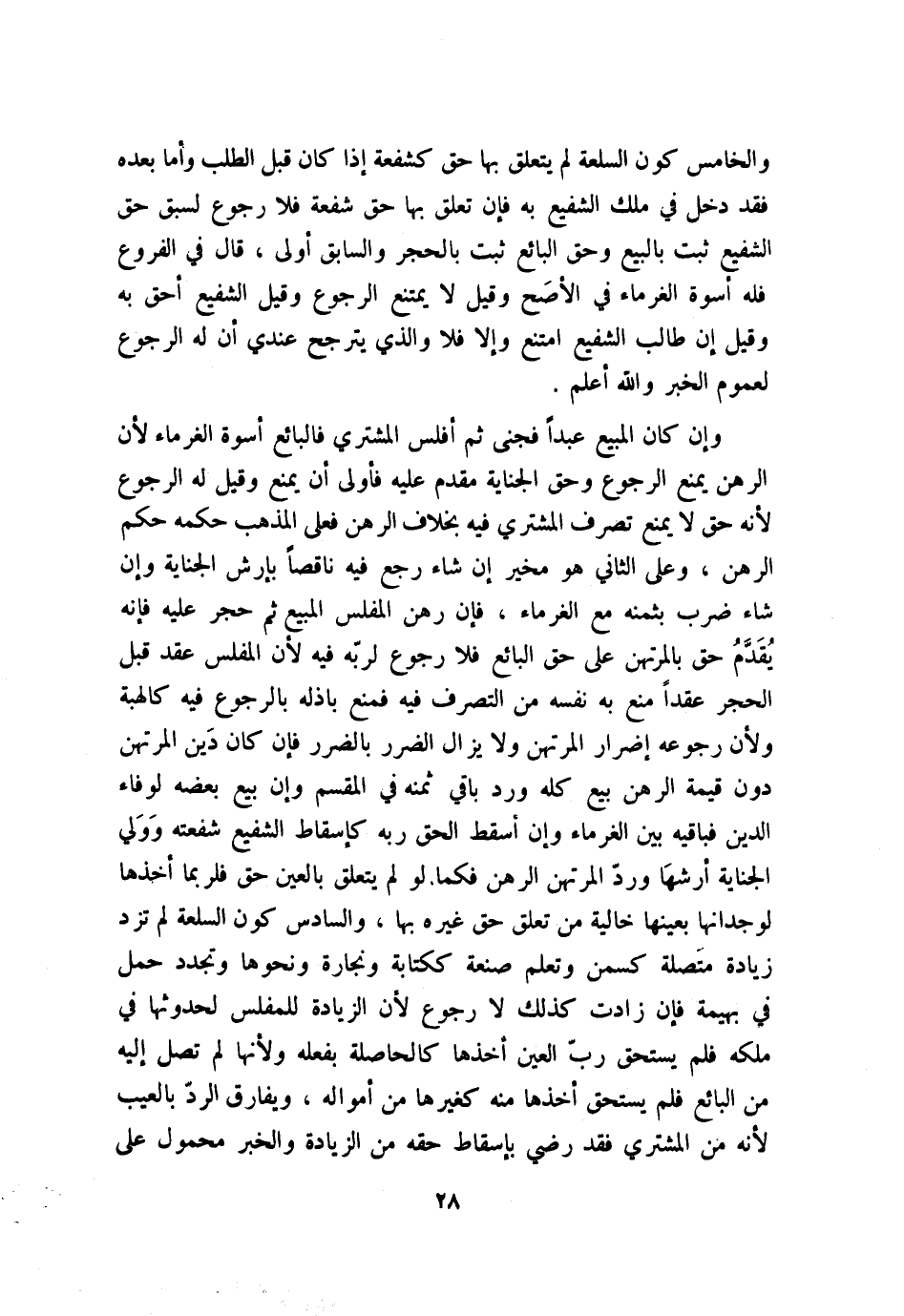 والخامس: كون السلعة لم يتعلق بها حق كشفعة إذا كان قبل الطلب وأما بعده فقد دخل في ملك الشفيع به؛ فإن تعلق بها حق شفعة فلا رجوع لسبق حق الشفيع ثبت بالبيع وحق البائع ثبت بالحجر والسابق أولى، قال في «الفروع» : فله أسوة الغرماء في الأصح، وقيل: لا يمتنع الرجوع، وقيل: الشفيع أحق به، وقيل: إن طالب الشفيع امتنع وإلا فلا والذي يترجح عندي أن له الرجوع لعموم الخبر. والله أعلم.