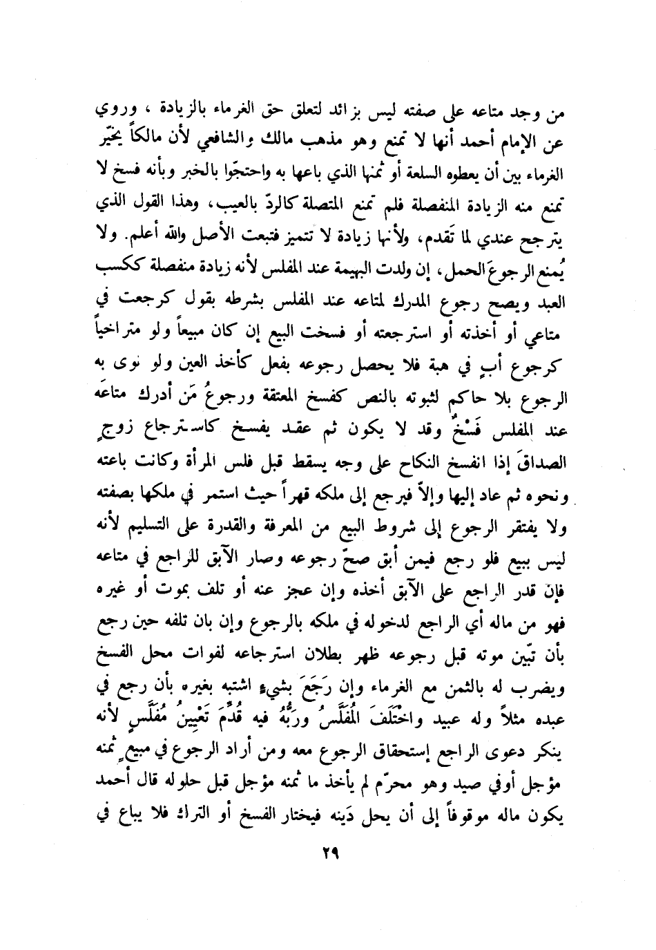 من وجد متاعه على صفته ليس بزائد لتعلق حق الغرماء بالزيادة، وروي عن الإمام أحمد أنها لا تمنع وهو مذهب مالك والشافعي؛ لأن مالكًا يخير الغرماء بين أن يعطوه السلعة أو ثمنها الذي باعها به واحتجّوا بالخبر وبأنه فسخ لا تمنع منه الزيادة المنفصلة فلم تمنع المتصلة كالردّ الغيب. وهذا القول الذي يترجح عندي لما تقدم، ولأنها زيادة لا تتميز فتبعت الأصل. والله أعلم. ولا يُمنع الرجوع الحمل، إن ولدت البهيمة عند المفلس؛ لأنه زيادة منفصلة ككسب العبد ويصح رجوع المدرك لمتاعه عند المفلس بشرطه بقول كرجعت في متاعي أو أخذته أو استرجعته أو فسخت البيع إن كان مبيعًا أو متراخيًا كرجوع أبٍ في هبة فلا يحصل رجوعه بفعل كأخذ العين ولو نوى به الرجوع بلا حاكم لثبوته بالنص كفسخ المعتقة ورجوعُ من أدرك متاعه عند المفلس فسخ، وقد لا يكون ثم عقد يفسخ كاسترجاع زوجٍ الصداق إذا انفسخ النكاح على وجه يسقط قبل فلس المرأة وكانت باعته ونحوه ثم عاد إليها وإلا فيرجع إلى ملكه قهرًا حيث استمر في ملكها بصفته ولا يفتقر الرجوع إلى شروط البيع من المعرفة والقدرة على التسليم؛ لأنه ليس ببيع فلو رجع فيمن أبق صحّ رجوعه وصار الآبق للراجع في متاعه؛ فإن قدر الراجح على الآبق أخذه، وإن عجز عنه أو تلف بموت أو غيره فهو من ماله، أي: الراجح لدخوله في ملكه بالرجوع وإن بان تلفه حين رجع بأن تبين موته قبل رجوعه ظهر بطلان استرجاعه لفوات محل الفسخ ويضرب له بالثمن مع الغرماء وإن رَجَعَ بشيء اشتبه بغيره بأن رجع في عبده مثلًا