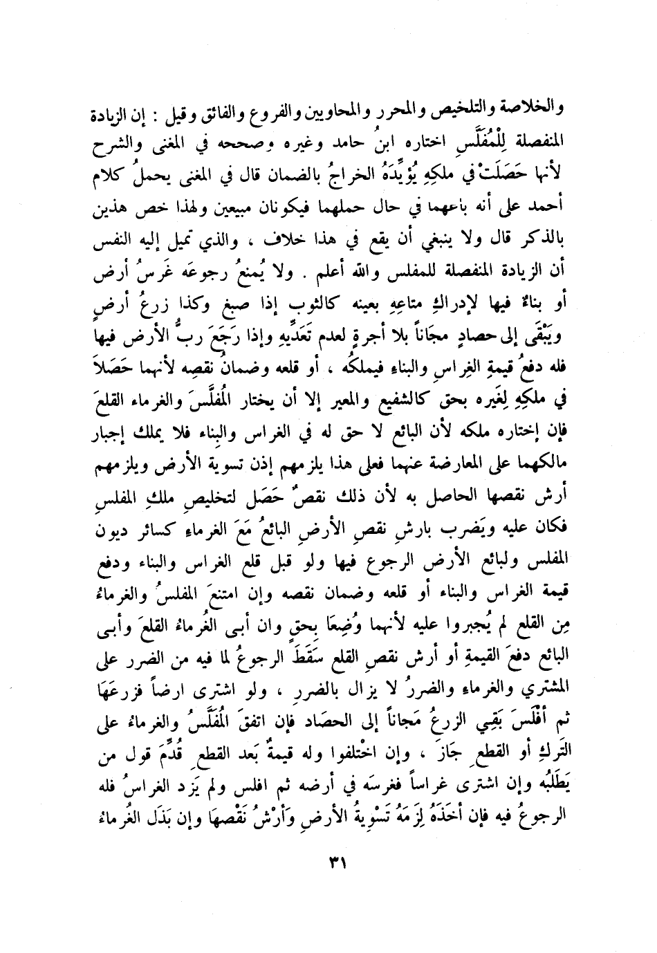 و «الخلاصة» ، و «التخليص» ، و «المحرر» ، و «المحاويين» ، و «الفروع» ، و «الفائق» . وقيل: إن الزيادة المنفصلة للمفلس، اختاره ابن حامد وغيره، وصححه في «المغني» ، و «الشرح» لأنها حصلت في ملكه يُؤيده الخراجُ بالضمان، قال في «المغني» : يحمل كلام أحمد على أنه باعهما في حال حملهما فيكونان مبيعين؛ ولهذا خص هذين بالذكر، قال: ولا ينبغي أن يقع في هذا خلاف، والذي تميل إليه النفس أن الزيادة المنفصلة للمفلس. والله أعلم. ولا يمنع رجوعه غرسُ أرض أو بناءٌ فيها لإدراك متاعه بعينه كالثوب إذا صبغ، وكذا زرع أرضٍ ويبقى إلى حصادٍ مجانًا بلا أجرةٍ لعدم تعدِّيه، وإذا رجع ربُّ الأرض فيها فله دفعُ قيمة الغراس والبناء فيملكُه، أو قلعه وضمانُ نقصه؛ لأنهما حصلا في ملكه لغيره بحق كالشفيع والمعير إلا أن يختار المفلس والغرماء القلع؛ فإن اختاره ملكه؛ لأن البائع لا حق له في الغراس والبناء فلا يملك إجبار مالكهما على المعارضة عنهما فعلى هذا يلزمهم إذن تسوية الأرض ويلزمهم أرش نقصها الحاصل به؛ لأن ذلك نقص حصل لتخليص ملك المفلس فكان عليه ويضرب بأرش نقص الارض البائع مع الغرماء كسائر ديون المفلس ولبائع الأرض الرجوع فيها، ولو قبل قلع الغراس والبناء ودفع قيمة الغراس والبناء أو قلعه وضمان نقصه وإن امتنع المفلس والغرماء من القلع لم يُجبروا عليه؛ لأنهما وُضعا بحق وإن أبى الغُرماء القلع وأبى البائع دفع القيمة أو أرش نقص القلع سقط الرجوعُ لما فيه من الضرر على المشتري والغرماء والضرر لا يزال بالضرر، ولو اشترى أرضًا فزرعها ثم أفلس بقي الزرعُ مجانًا إلى الحصاد؛ فإن اتفق المُفلسُ والغرماءُ على الترك أو القطع جاز، وإن اختلفوا وله قيمةٌ بعد القطع قُدِّم قول من يطلبه وإن اشترى غراسًا فغرسه في أرضه ثم أفلس، ولم يزد الغراس فله الرجوع فيه؛ فإن أخذه لزمه تسوية الأرض وأرش نقصها وإن بذل الغرماء