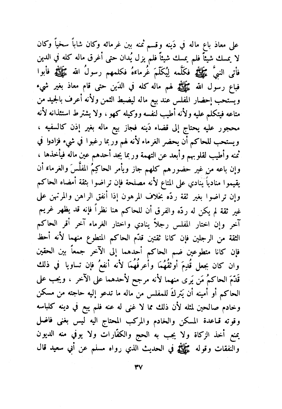 على معاذ باع ماله في دَينه وقسم ثمنه بين غرمائه، وكان شابًا سخيًا، وكان لا يمسك شيئًا فلم يمسك شيئًا فلم يزل يُدان حتى أغرق ماله كله في الدين، فأتى النبي - صلى الله عليه وسلم - فكلَّمه ليُكلم غُرماءهُ، فكلمهم رسول الله - صلى الله عليه وسلم -، فأبوا، فباع رسول الله - صلى الله عليه وسلم - ماله كله في الدين حتى قام معاذ بغير شيء ويستحب إحضار المفلس عند بيع ماله ليضبط الثمن، ولأنه أعرف بالجيد من متاعه فيتكلم عليه، ولأنه أطيب لنفسه ووكيله كهو، ولا يشترط استئذانه؛ لأنه محجور عليه يحتاج إلى قضاء دينه فجاز بيع ماله بغير إذن كالسفيه.
