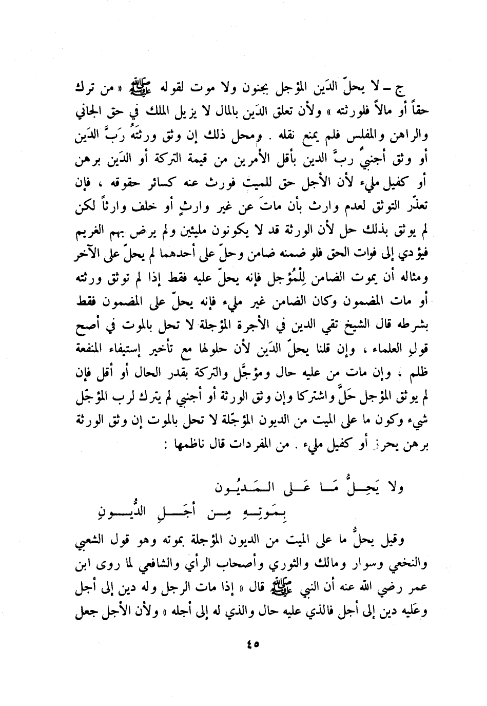 ولا يَحِلُّ مَا عَلى المَديُون ... بِمَوتِهِ مِن أجَلِ الدُّيونِ