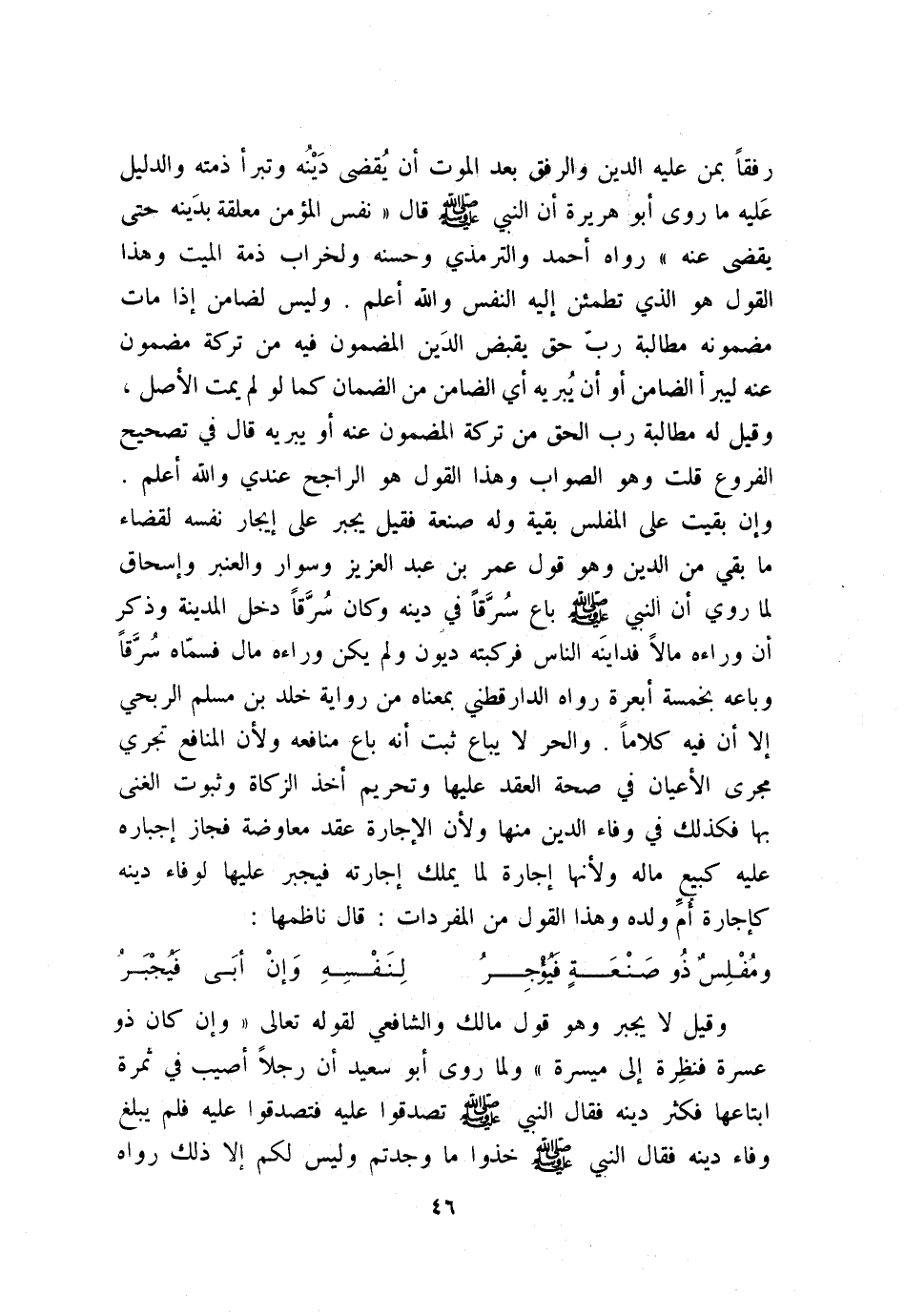 رفقًا بمن عليه الدين والرفق بعد الموت أن يُقضي دينه وتبرأ ذمته، والدليل عليه ما روى أبو هريرة: أن النبي - صلى الله عليه وسلم - قال: «نفس المؤمن معلقة بدَينه حتى يُقضى عنه» رواه أحمد والترمذي وحسنه، ولخراب ذمة الميت، وهذا القول هو الذي تطمئن إليه النفس. والله أعلم. وليس لضامن إذا مات مضمونة مطالبة رب حق يقبض الدين المضمون فيه من تركة مضمون عنه ليبرأ الضامن أو أن يُبريه أي الضامن من الضمان كما ل لم يمت الأصل، وقيل: له مطالبة رب الحق من تركة المضمون عنه أو يبريه، قال في «تصحيح الفروع» : قلت: وهو الصواب، وهذا القول هو الراجح عندي. والله أعلم. وإن بيت على المفلس بقية وله صنعة، فقيل يجبر على إيجار نفسه لقضاء ما بقي من الدين وهو قول عمر بن عبد العزيز وسوار والعنبر وإسحاق؛ لما روي «أن النبي - صلى الله عليه وسلم - باع سُرَّقًا في دينه، وكان سُرَّقًا دخل المدينة، وذكر أن وراءه مالًا فداينه الناس فركبته ديون، ولم يكن وراءه مال فسمّاه سُرَّقًا وباعه بخمسة أبعرة» رواه الدارقطني بمعناه من رواة خلد بن مسلم الربحي إلا أن فيه كلامًا. والحر لا يباع ثبت أنه باع منافعه؛ ولأن المنافع مجرى الأعيان في صحة العقد عليها وتحريم أخذ الزكاة وثبوت الغنى بها فكذلك في وفاء الدين منها؛ ولأن الإجارة عقد معاوضة فجاز إجباره عليه كبيع ماله ولأنها إجارة لما يملك إجارته فيجبر عليها لوفاء دينه كإجارة أم ولده، وهذا القول من المفردات: قال ناظمها: