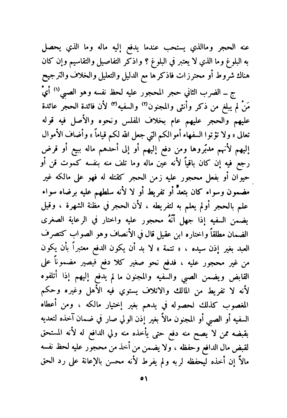ج: الضرب الثاني: حجر المحجور عليه لحظ نفسه وهو الصبي (1) ، أيْ: مَنْ لم يبلغ من ذكر وأنثى والمجنون (2) والسفيه (3) ؛ لأن فائدة الحجر عائدة عليهم والحجر عليهم عام بخلاف المفلس ونحوه والأصل فيه قوله تعالى: {وَلاَ تُؤْتُوا السُّفَهَاءَ أَمْوَالَكُمُ الَتِي جَعَلَ اللَّهُ لَكُمْ قِيَاماً} وأضاف الأموال إليهم؛ لأنهم مدبّروها ومن دفع إليهم أو إلى أحدهم ماله ببيع أو قرض رجع فيه إن كان باقيًا؛ لأنه عين ماله وما تلف منه بنفسه كموت قن أو حيوان أو بفعل محجور عليه زمن الحجر كقتله له فهو على مالكه غير مضمون وسواء كان بتعدِّ أو تفريط أو لا؛ لأنه سلطهم عليه برضاه سواء علم بالحجر أو لم يعلم به لتفريطه؛ لأن الحجر في مظنة الشهرة، وقيل: يضمن السفيه إذا جهل أنهُ محجور عليه، واختار في «الرعاية الصغرى» الضمان مطلقًا، واختاره ابن عقيل، قال في «الإنصاف» : وهو الصواب كتصرف العبد بغير إذن سيده.