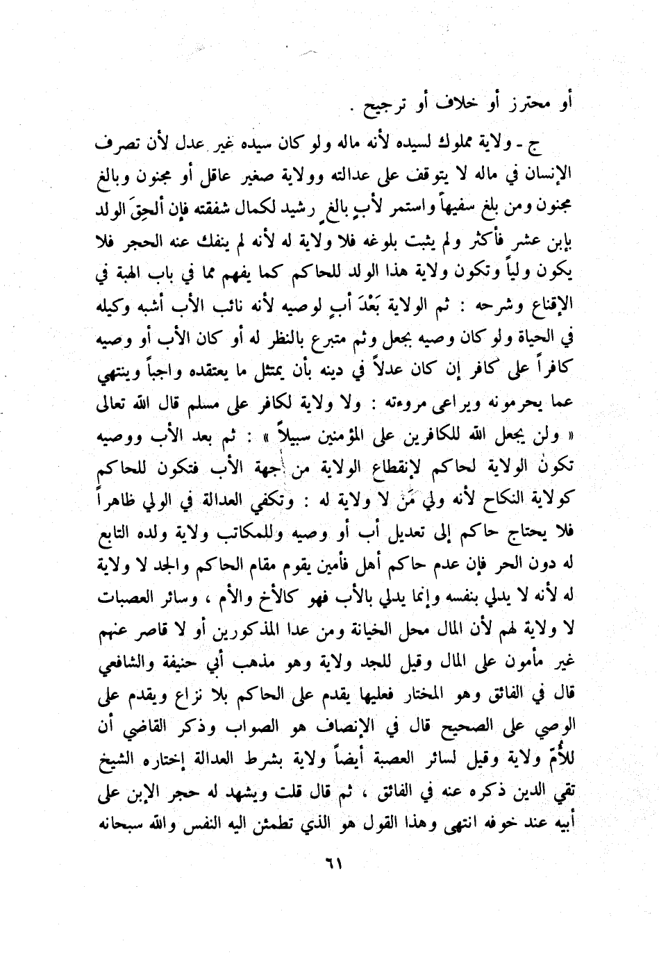 ج: ولاية مملوك لسيدة؛ لأنه ماله ولو كان سيده غير عدل؛ لأن تصرف الإنسان من ماله لا يتوقف على عدالته وولاية صغير عاقل أو مجنون وبالغ مجنون، ومن بلغ سفيهًا واستمر لأبٍ بالغٍ رشيد لكمال شفقته؛ فإن ألحقَ الولد بإبن عشر فأكثر ولم يثبت بلوغه فلا ولاية له؛ لأنه لم ينفك عنه الحجر، فلا يكون وليًا، وتكون ولاية هذا الولد للحاكم كما يفهم مما في باب الهبة في «الإقناع وشرحه» : ثم الولاية بَعْدَ أبٍ لوصيه؛ لأنه نائب الأب أشبه وكيله في الحياة ولو كان وصيه بجعل وثم متبرع بالنظر له أو كان الأب أو وصيه كافرًا على كافر إن كان عدلًا في دينه بأن يمتثل ما يعتقده واجبًا وينتهي عما يحرمونه ويراعى مروءته، ولا ولاية لكافر على مسلم، قال الله تعالى: {وَلَن يَجْعَلَ اللَّهُ لِلْكَافِرِينَ عَلَى المُؤْمِنِينَ سَبِيلاً} ثم بعد الأب ووصيه تكون الولاية لحاكم لإنقطاع الولاية من جهة الأب فتكون للحاكم كولاية النكاح؛ لأنه ولي مَن لا ولاية له، وتكفي العدالة في الولي ظاهرًا فلا يحتاج حاكم إلى تعديل أب أو وصية وللمكاتب ولاية ولده التابع له دون الحر؛ فإن عدم حاكم أهل فأمين يقوم مقام الحاكم والجد لا ولاية له؛ لأنه لا يدلي بنفسه وإنما يدلي بالأب فهو كالأخ والأم، وسائر العصبات لا ولاية لهم؛ لأن المال محل الخيانة ومن عدا المذكورين أو لا قاصر عنهم غير مأمون على المال، وقيل: للجد ولاية، وهو مذهب أبي حنيفة والشافعي. قال في «الفائق» : وهو المختار فعليها يقدم على الحاكم بلا نزاع، ويقدم على الوصي على الصحيح. قال في «الإنصاف» : هو الصواب، وذكر القاضي أن للأُّم ولاية، وقيل: لسائر العصبة أيضًا ولاية بشرط العدالة اختاره الشيخ تقي الدين، ذكره عنه في الفائق، ثم قال: قلت: ويشهد له حجر الإبن على أبيه عند خوفه. انتهى. وهذا القول هو الذي تطمئن إليه النفس، والله سبحانه