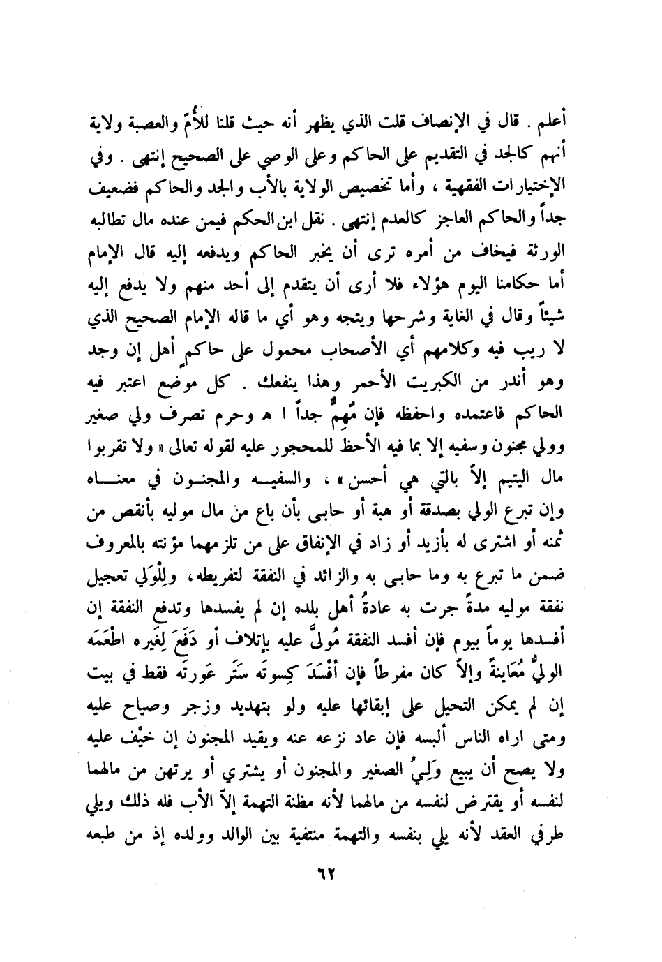 وتعالى أعلم. قال في «الإنصاف» : قلت: الذي يظهر أنه حيث قلنا للأُّم والعصبة ولاية أنهم كالجد في التقديم على الحاكم وعلى الوصي على الصحيح. انتهى. وفي «الاختيارات الفقهية» : وأما تخصيص الولاية بالأب والجد والحاكم فضعيف جدًا، والحاكم العاجز كالعدم. انتهى. نقل ابن الحكم فيمن عنده مال تطالبه الورثة فيخاف من أمره ترى أن يخبر الحاكم ويدفعه إليه؟ قال الإمام: أما حكامنا اليوم هؤلاء فلا أرى أن يتقدم إلى أحد منهم ولا يدفع إليه شيئًا، وقال في «الغاية وشرحها» : ويتجه وهو أي ما قاله الإمام الصحيح الذي لا ريب فيه وكلامهم أي الأصحاب محمول على حاكمٍ أهل إن وجد وهو أندر من الكبريت الأحمر، وهذا ينفعك. كل موضع اعتبر فيه الحاكم فاعتمده واحفظه؛ فإن مُهم جدًا. اهـ. وحرم تصرف ولي صغير وولي مجنون وسفيه إلا بما فيه الأحظ للمحجور عليه؛ لقوله تعالى: {وَلاَ تَقْرَبُوا مَالَ اليَتِيمِ إِلاَّ بِالَّتِي هِيَ أَحْسَنُ} ، والسفيه والمجنون في معناه وإن تبرع الولي بصدقة أو هبة أو حابة بأن باع من مال موليه بأنقص من ثمنه أو اشترى له بأزيد أو زاد في الإنفاق على من تلزمهما مؤنته بالمعروف ضمن ما تبرع به وما حابى به، والزائد في النفقة لتفريطه، ولِلْوَلي تعجيل نفقة موليه مدةً جرت به عادةُ أهل بلده إن لم يفسدها وتدفع النفقة إن أفسدها يومًا بيوم؛ فإن أفسد النفقة مُولى عليه بإتلاف أو دَفَعَ لغيره أطعمه الوليُّ معاينة، وإلا كان مفرطًا؛ فإن أفسد كسوته ستر عورته فقط في بيت إن لم يمكن التحيل على إبقائها عليه ولو بتهديد وزجر وصياح عليه ومتى أراه الناس ألبسه؛ فإن عاد نزعه عنه ويقيد المجنون إن خيْف عليه، ولا يصح أن يبيع وليُ الصغير والمجنون أو يشتري أو يرتهن من مالهما لنفسه أو يقترض لنفسه من مالهما؛ لأنه مظنة التهمة إلا الأب فله ذلك ويلي طرفي العقد؛ لأنه يلي بنفسه والتهمة منفية بين الوالد وولده إذ من طبعه