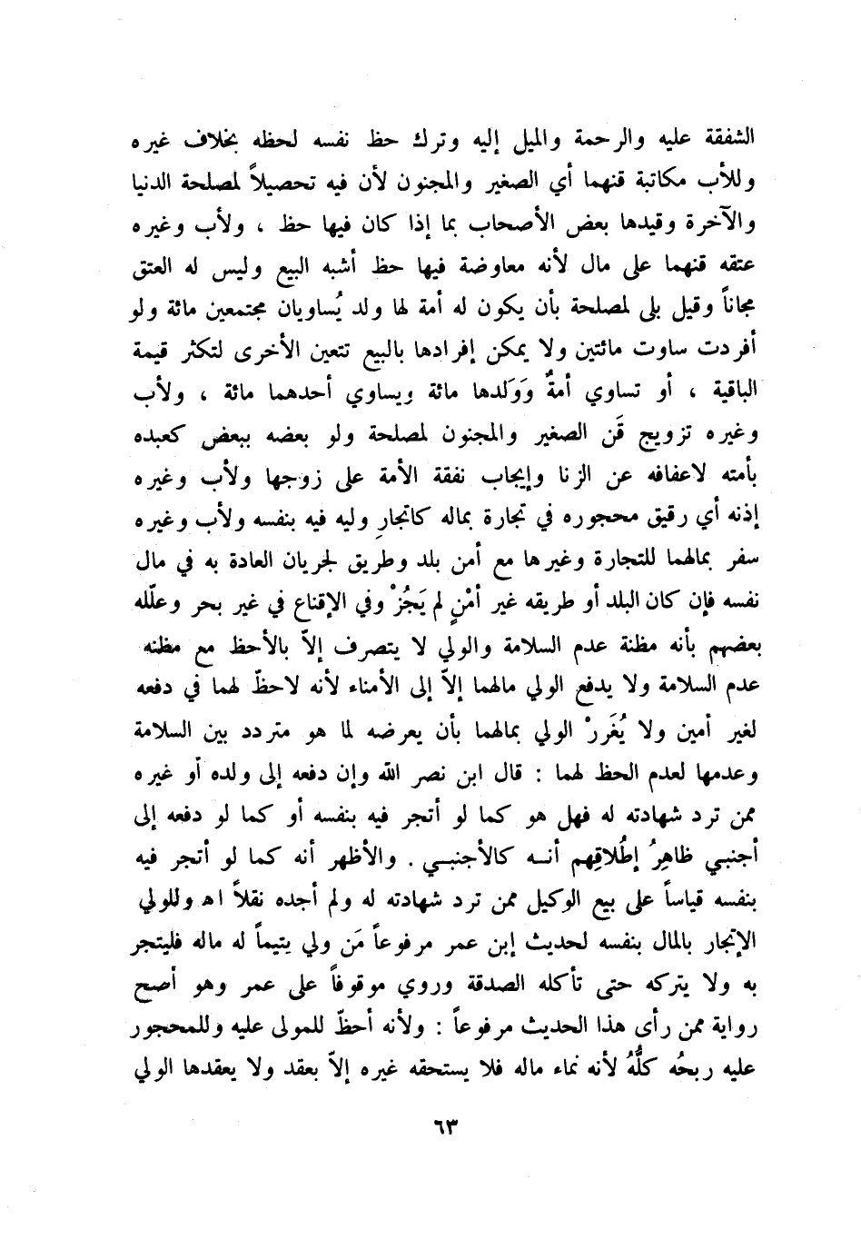 الشفقة عليه والرحمة والميل إليه وترك حظ نفسه لحظه بخلاف غيره وللأب مكاتبة قنهما أي الصغير والمجنون؛ لأن فيه تحصيلًا لمصلحة الدنيا والآخرة وقيدها بعض الأصحاب بما إذا كان فيها حظ، ولأب وغيره عتقه قنهما على مال؛ لأنه معاوضة فيها حظ أشبه البيع وليس له العتق مجانًا، وقيل: بلى لمصلحة بأن يكون له أمة لها ولد يُساويان مجتمعين مائة ولو أفردت ساوت مائتين ولا يمكن إفرادها بالبيع تتعين الأخرى لتكثر قيمة الباقية، أو تساوي أمةٌ وَولدها مائة ويساوي أحدهما مائة، ولأب وغيره تزويج قن الصغير والمجنون لمصلحة ولو بعضه ببعض كعبده بأمته لإعفافه عن الزنا وإيجاب نفقة الأمة على زوجها ولأب وغيره إذنه أي رقيق محجوره في تجارة بماله كإتجار وليه فيه بنفسه ولأب وغيره سفر مالهما للتجارة وغيرها مع أمن بلد وطريق لجريان العادة به في مال نفسه؛ فإن كان البلد أو طريقه غير أمنٍ لم يجُز. وفي «الإقناع» : في غير بحر وعلله بعضهم بأنه مظنة عدم السلامة والولي لا يتصرف إلا بالأحظ مع مظنه عدم السلامة ولا يدفع الولي مالهما، إلا إلى الأمناء؛ لأنه لا حظّ لهما في دفعه لغير أمين ولا يُغَررْ الولي بمالهما بأن يعرضه لما هو متردد بين السلامة وعدمها لعدم الحظ لهما، قال ابن نصر الله: وإن دفعه إلى ولده أو غيره ممن ترد شهادته له فهل هو كما لو أتجر فيه بنفسه أو كما لو دفعه إلى أجنبي ظاهرُ إطلاقهم أنه كالأجنبي.