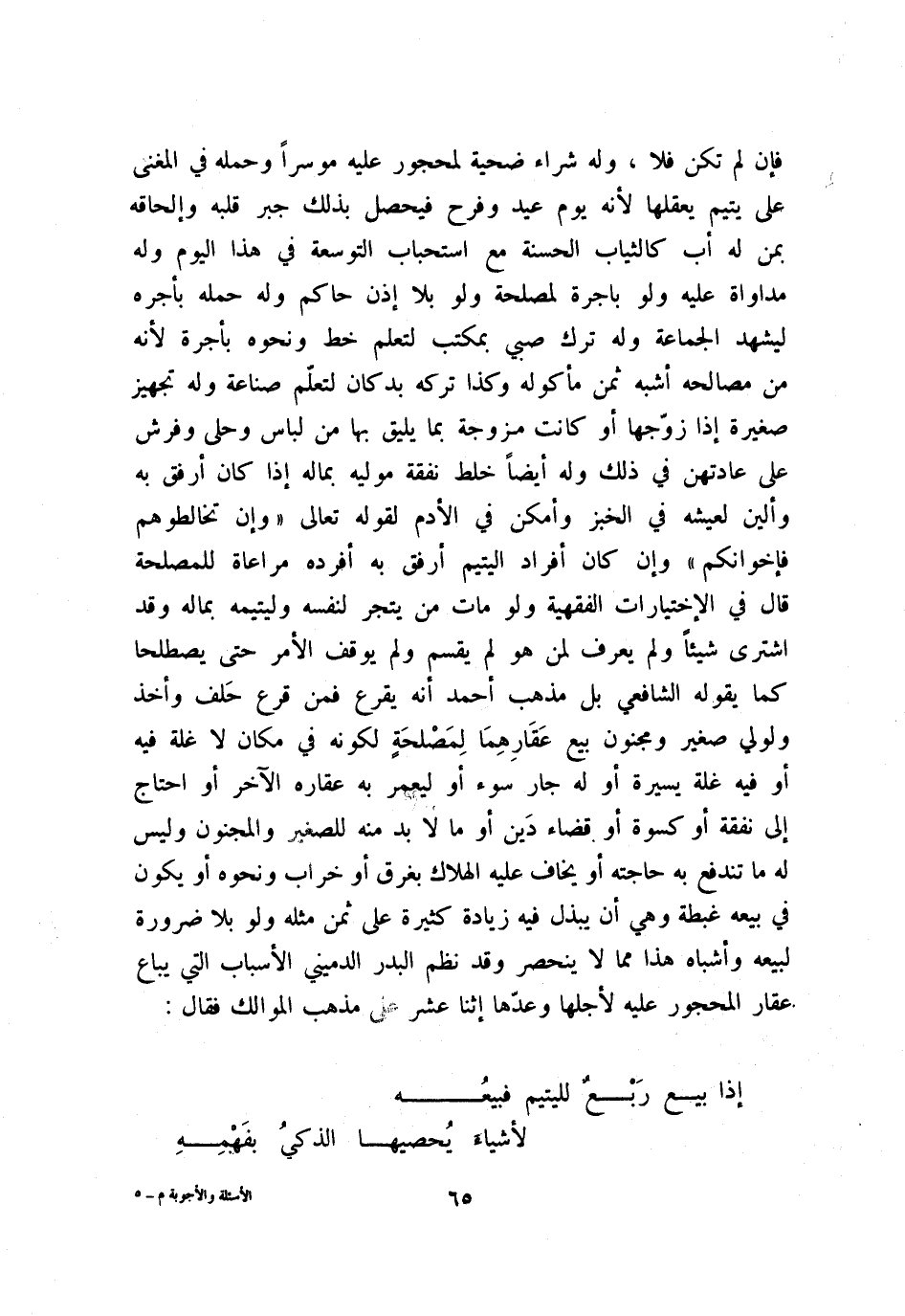 فإن لم تكن فلا، وله شراء ضحية لمحجور عليه موسرًا وحمله في «المغني» على يتيم يعقلها؛ لأنه يوم عيد وفرح فيحصل بذلك جبر قلبه وإلحاقه بمن له أب كالثياب الحسنة مع استحباب التوسعة في هذا اليوم وله مداواة عليه ولو بأجرة لمصلحة ولو بلا إذن حاكم وله حمله بأجره ليشهد الجماعة، وله ترك صبي بمكتب لتعلم خط ونحوه بأجرة؛ لأنه من مصالحه أشبه ثمن مأكوله، وكذا لو تركه بدكان لتعلّم صناعة وله تجهيز صغيرة إذا زوّجها أو كانت مزوجة بما يليق بها من لباس وحلي وفرش على عادتهن في ذلك، وله أيضًا خلط نفقة موليه بماله إذا كان أرفق به وألين لعيشه في الخبز وأمكن في الأدم؛ لقوله تعالى: {وَإِن تُخَالِطُوَهُمْ فَإِخْوَانُكُمْ} وإن كان أفراد اليتيم أرفق به أفرده مراعاة لمصلحة. قال في «الاختيارات الفقهية» : ولو مات من يتجر لنفسه وليتيمه بماله وقد اشترى شيئًا ولم يعرف لمن هو لم يقسم ولم يوقف الأمر حتى يصطلحا، كما يقوله الشافعي: بل مذهب أحمد أنه يقرع فمن قرع حَلف وأخذ ولولي صغير ومجنون بيع عقارهما لمصلحة لكونه ي مكان لا غلة فيه أو فيه غلة يسيرة أو له جار سوء أو ليعمر به عقاره الآخر أو احتاج إلى نفقة أو كسوة أو قضاء دين أو ما لابد منه للصغير والمجنون وليس له ما تندفع به حاجته أو يخاف عليه الهلاك بغرق أو خراب ونحوه أو يكون في بيعه غبطة، وهي أن يبذل فيه زيادة كثيرة على ثمن مثله ولو بلا ضرورة لبيعه وأشباه هذا مما لا ينحصر، وقد نظم البدر الدميني الأسباب التي يباع عقار المحجور عليه لأجلها وعدّها إثنا عشر على مذهب الموالك.