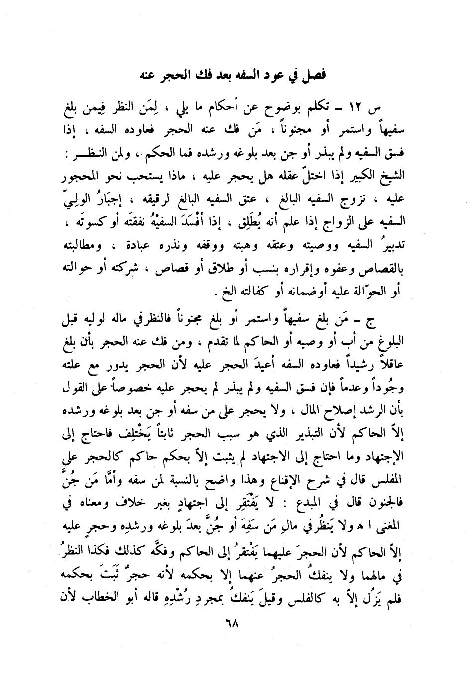 س12: تكلم بوضوح عن أحكام ما يلي: لِمَن النظر فيمن بلغ سفيهًا واستمر أو مجنونًا، مَن فك عنه الحجر فعاوده السفه، إذا فسق السفيه ولم يبذر أو جن بعد بلوغه ورشده فما الحكم، ولمن النظر: الشيح الكبير إذا اختلّ عقله هل يحجر عليه؟ ماذا يستحب نحو المحجور عليه، تزوج السفيه البالغ، عتق السفيه البالغ لرقيقه، إجبارُ الولي السفيه على الزواج إذا علم أنه يُطلق، إذا أفسد السفيه نفقته أو كسوته، تدبير السفيه ووصيته وعتقه وهبته ووقفه ونذره عبادة، ومطالبته بالقصاص وعفوه وإقراره بنسب أو طلاق أو قصاص، شركته أو حوالته أو الحوالة عليه أو ضمانه أو كفالته ... إلخ.