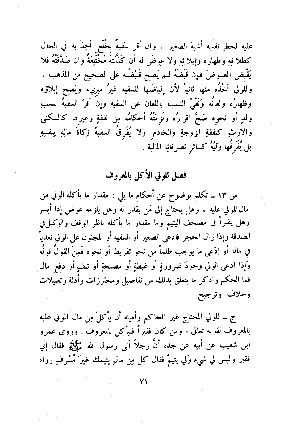 س13: تكلم بوضوح عن أحكام ما يلي: مقدار ما يأكله الولي من مال المولي عليه، وهل يحتاج إلى من يقدر له؟ وهل يلزمه عوض إذا أيسر؟ وهل يقرأ في مصحف اليتيم؟ وما مقدار ما يأكله ناظر الوقف والوكيل في الصدقة وإذا زال الحجر فادعى الصغير أو السفيه أو المجنون على الولي تعديًا في ماله أو ادّعى ما يوجب ظلمًا من نحو تفريط أو نحوه فَمِنَ القولُ قولُه وإذا ادعى الولي وجودَ ضرورةٍ أو غبطةٍ أو مصلحةٍ أو تلفٍ أو دفع مال، فما الحكم؟ واذكر ما يتعلق بذلك من تفاصيل ومحترزات وأدلة وتعليلات وخلاف وترجيح.
