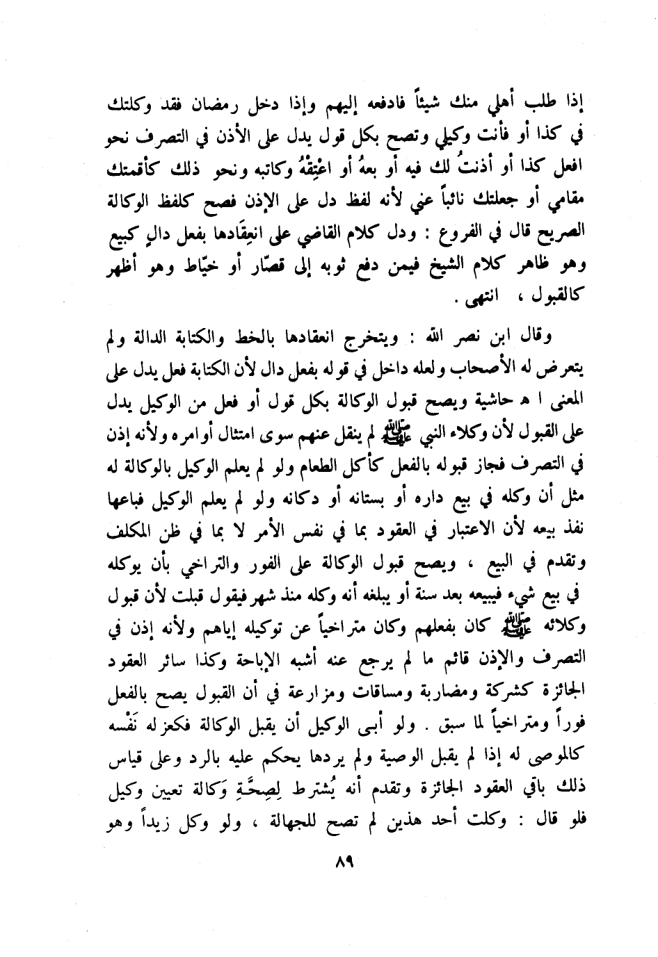 وقال ابن نصر الله: ويتخرج انعقادها بالخط والكتابة الدالة، ولم يتعرض له الأصحاب ولعله داخل في قوله بفعل دال؛ لأن الكتابة فعل يدل على المعنى. اهـ حاشية. ويصح قبول الوكالة بكل قول أو فعل من الوكيل يدل على القبول؛ لأن وكلاء النبي - صلى الله عليه وسلم - لم ينقل عنهم سوى امتثال أوامره؛ ولأن إذن في التصرف فجاز قبوله بالفعل كأكل الطعام ولو لم يعلم الوكيل بالوكالة له مثل أو وكله في بيع داره أو بستانه أو دكانه، ولو لم يعلم الوكيل فباعها نفذ بيعه؛ لأن الاعتبار في العقود بما في نفس الأمر لا بما في ظن المكلف وتقدم في البيع، ويصح قبول الوكالة على الفور والتراخي بأن يوكله في بيع شيء فيبيعه بعد سنة أو يبلغه أنه وكله منذ شهر، فيقول: قبلت؛ لأن قبول وكلائه - صلى الله عليه وسلم - كان بفعلهم وكان متراخيًا عن توكيله إياهم؛ ولأنه إذن في التصرف والإذن قائم ما لم يرجع عنه أشبه الإباحة، وكذا سائر العقود الجائزة كشركة ومضاربة ومساقات ومزارعة في أن القبول يصح بالفعل فورًا ومتراخيًا لما سبق، ولو أبى الوكيل أن يقبل الوكالة فكعزله نَفْسه كالموصى له إذا لم يقبل الوصية ولم يردها يحكم عليه بالرد، وعلى قياس ذلك باقي العقود الجائزة وتقدم أنه يُشترط لصحَّة وكالة تعيين وكيل، فلو قال: وكلت أحد هذين لم تصح للجهالة، ولو وكل زيدًا وهو