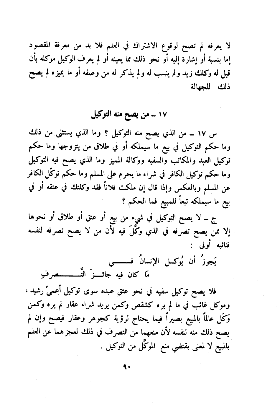 س17: من الذي يصح منه التوكيل؟ وما الذي يُستثنى من ذلك؟ وما حكم التوكيل في بيع ما سيملكه أو في طلاق من يتزوجها؟ وما حكم توكيل العبد والمكاتب والسفيه ووكالة المميز؟ وما الذي يصح فيه التوكيل؟ وما حكم توكيل الكافر في شراء ما يحرم على المسلم؟ وما حكم توكّل الكافر عن المسلم وبالعكس، وإذا قال: إن ملكت فلانًا، فقد وكلتك في عتقه أو في بيع ما سيملكه تبعًا للمبيع، فما الحكم؟