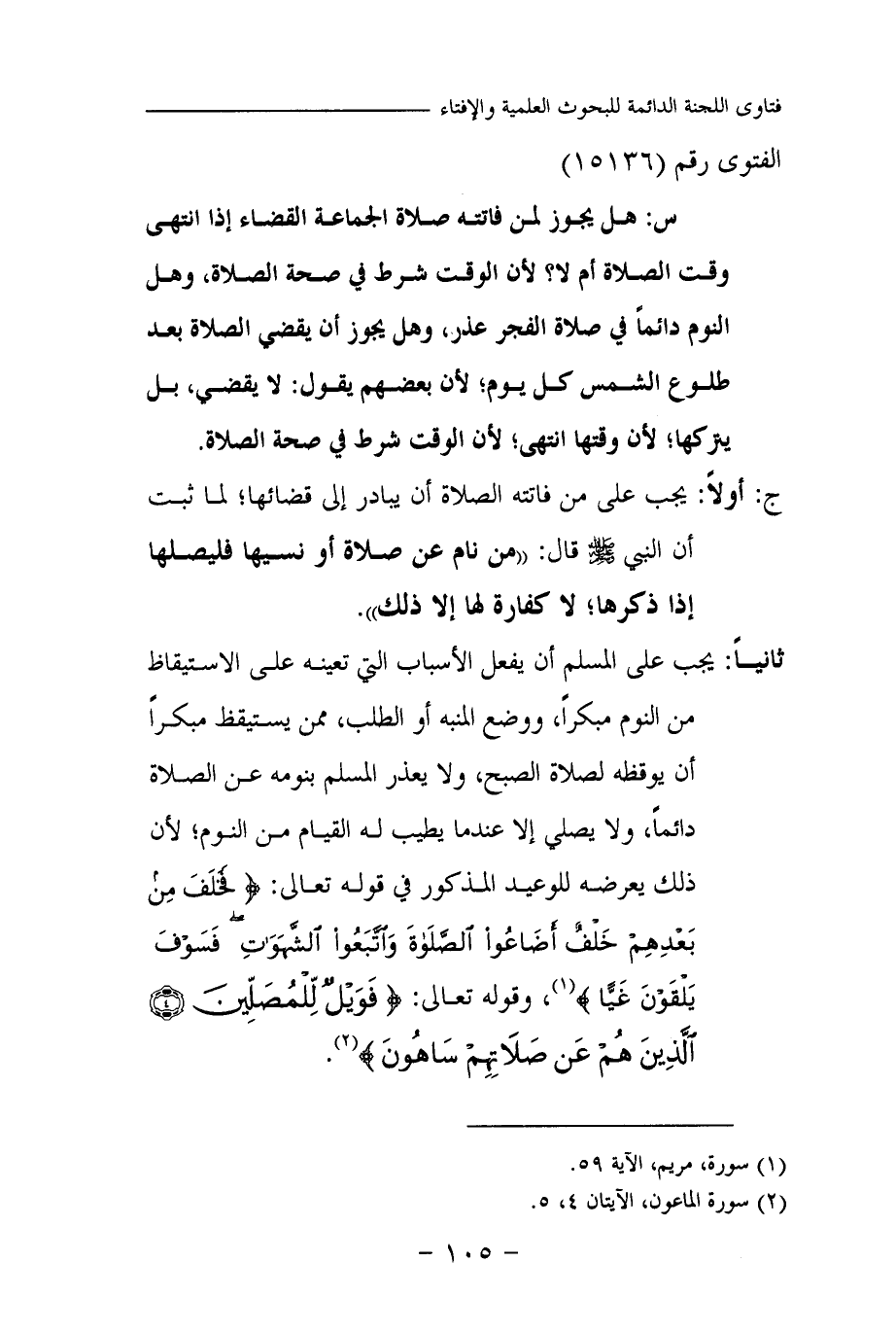 ثانيا: يجب على المسلم أن يفعل الأسباب إلي تعينه على الاستيقاظ من النوم مبكرا، ووضع المنبه أو الطلب، ممن يستيقظ مبكرا أن يوقظه لصلاة الصبح، ولا يعذر المسلم بنومه عن الصلاة دائما، ولا يصلي إلا عندما يطيب له القيام من النوم؛ لأن ذلك يعرضه للوعيد المذكور في قوله تعالى: {فَخَلَفَ مِنْ بَعْدِهِمْ خَلْفٌ أَضَاعُوا الصَّلَاةَ وَاتَّبَعُوا الشَّهَوَاتِ فَسَوْفَ يَلْقَوْنَ غَيًّا} (¬2) وقوله تعالى: {فَوَيْلٌ لِلْمُصَلِّينَ} (¬3) {الَّذِينَ هُمْ عَنْ صَلَاتِهِمْ سَاهُونَ} (¬4) .