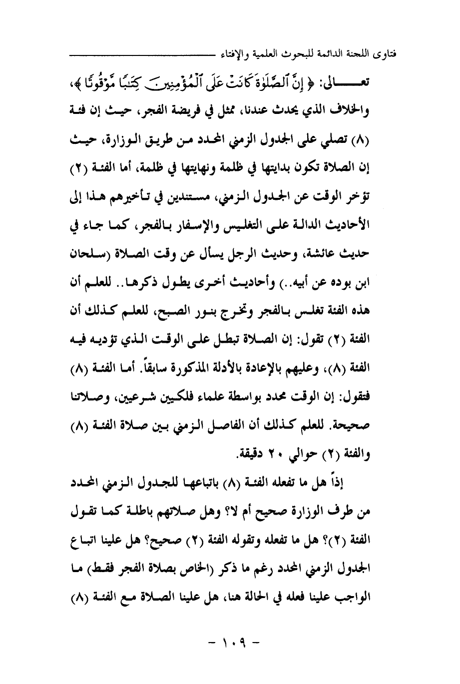 تعالى: {إِنَّ الصَّلَاةَ كَانَتْ عَلَى الْمُؤْمِنِينَ كِتَابًا مَوْقُوتًا} (¬1) والخلاف الذي يحدث عندنا، ممثل في فريضة الفجر، حيث إن فئة (8) تصلي على الجدول الزمني المحدد من طريق الوزارة، حيث إن الصلاة تكون بدايتها في ظلمة ونهايتها في ظلمة، أما الفئة (2) تؤخر الوقت عن الجدول الزمني، مستندين في تأخيرهم هذا إلى الأحاديث الدالة على التغليس والإسفار بالفجر، كما جاء في حديث عائشة، وحديث الرجل يسأل عن وقت الصلاة (سلحان بن بودة عن أبيه. .) وأحاديث أخرى يطول ذكرها. . للعلم أن هذه الفئة تغلس بالفجر وتخرج بنور الصبح، للعلم كذلك أن الفئة (2) تقول: إن الصلاة تبطل على الوقت الذي تؤديه فيه الفئة (8) ، وعليهم بالإعادة بالأدلة المذكورة سابقا. أما الفئة (8) فتقول: إن الوقت محدد بواسطة علماء فلكيين شرعيين، وصلاتنا صحيحة. للعلم كذلك أن الفاصل الزمني بين صلاة الفئة (8) والفئة (2) حوالي 20 دقيقة.