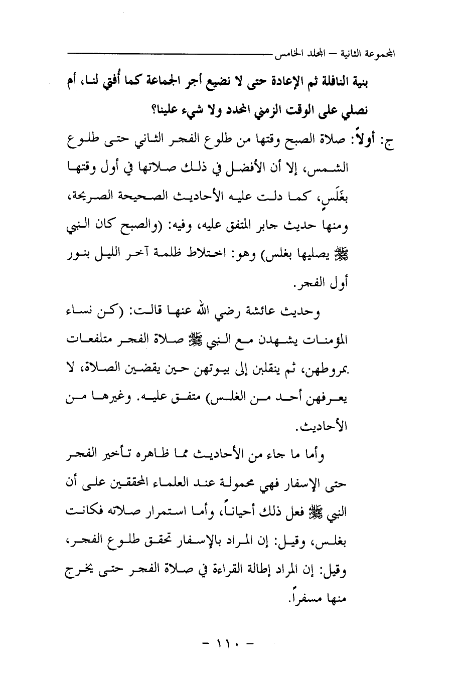 ج: أولا: صلاة الصبح وقتها من طلوع الفجر الثاني حتى طلوع الشمس، إلا أن الأفضل في ذلك صلاتها في أول وقتها بغلس، كما دلت عليه الأحاديث الصحيحة الصريحة، ومنها حديث جابر المتفق عليه، وفيه: «والصبح كان النبي صلى الله عليه وسلم يصليها بغلس (¬1) » وهو: اختلاط ظلمة آخر الليل بنور أول الفجر.