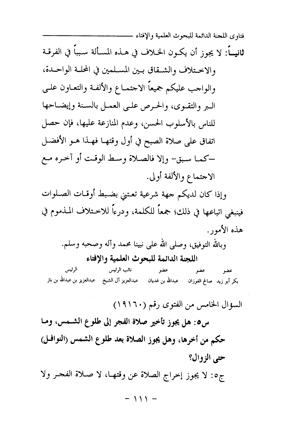 ج 5: لا يجوز إخراج الصلاة عن وقتها، لا صلاة الفجر ولا