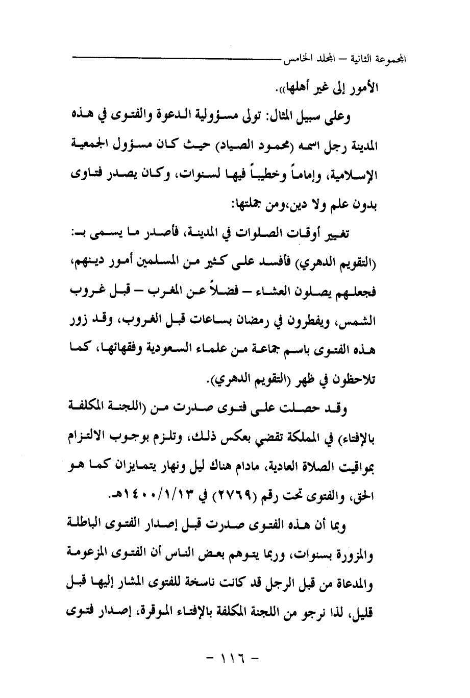 تغيير أوقات الصلوات في المدينة، فأصدر ما يسمى بـ: (التقويم الدهري) فأفسد على كثير من المسلمين أمور دينهم، فجعلهم يصلون العشاء- فضلا عن المغرب- قبل غروب الشمس، ويفطرون في رمضان بساعات قبل الغروب، وقد زور هذه الفتوى باسم جماعة علماء السعودية وفقهائها، كما تلاحظون في (التقويم الدهري) .
