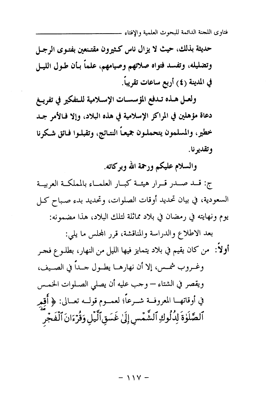 ج: قد صدر قرار هيئة كبار العلماء بالمملكة العربية السعودية، في بيان تحديد أوقات الصلوات، وتحديد بدء صباح كل يوم ونهايته في رمضان في بلاد مماثلة لتلك البلاد، هذا مضمونه: