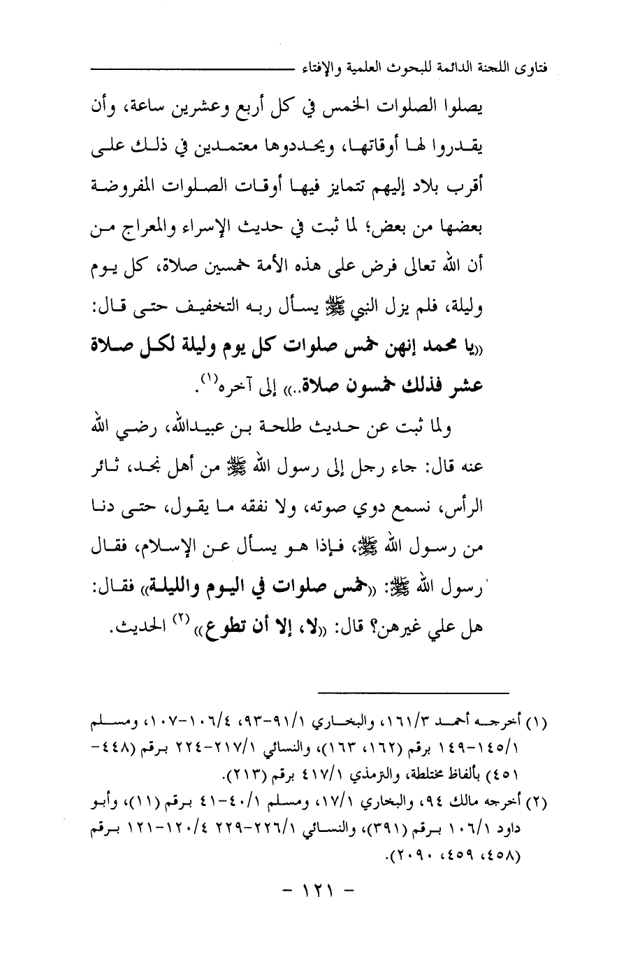 يصلوا الصلوات الخمس في كل أربع وعشرين ساعة، وأن يقدروا لها أوقاتها، ويحددوها معتمدين في ذلك على أقرب بلاد إليهم تتمايز فيها أوقات الصلوات المفروضة بعضها من بعض؛ لما ثبت في حديث الإسراء والمعراج من «أن الله تعالى فرض على هذه الأمة خمسين صلاة، كل يوم وليلة، فلم يزل النبي صلى الله عليه وسلم يسأل ربه التخفيف حتى قال: يا محمد إنهن خمس صلوات كل يوم وليلة لكل صلاة عشر فذلك خمسون صلاة (¬1) » . إلى آخره