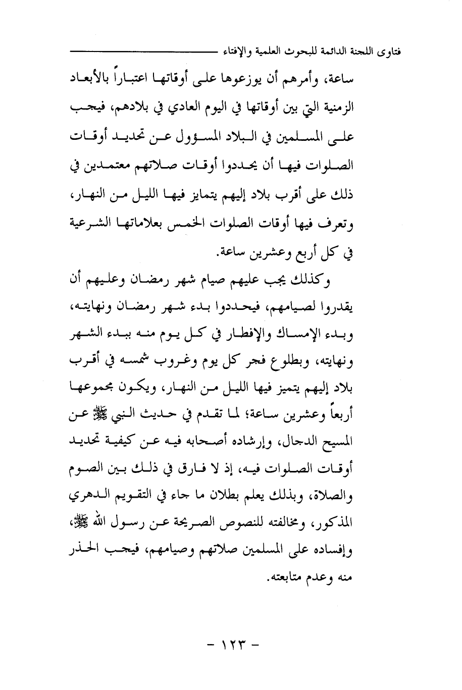ساعة، وأمرهم أن يوزعوها على أوقاتها اعتبارا بالأبعاد الزمنية التي بين أوقاتها في اليوم العادي في بلادهم، فيجب على المسلمين في البلاد المسؤول عن تحديد أوقات الصلوات فيها أن يحددوا أوقات صلاتهم معتمدين في ذلك على أقرب بلاد إليهم يتمايز فيها الليل من النهار، وتعرف فيها أوقات الصلوات الخمس بعلاماتها الشرعية في كل أربع وعشرين ساعة.