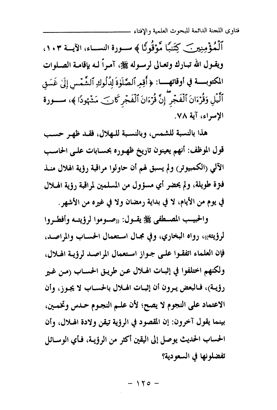 {إِنَّ الصَّلَاةَ كَانَتْ عَلَى الْمُؤْمِنِينَ كِتَابًا مَوْقُوتًا} (¬1) ويقول الله تبارك وتعالى لرسوله صلى الله عليه وسلم، آمرا له بإقامة الصلوات المكتوبة في أوقاتها: {أَقِمِ الصَّلَاةَ لِدُلُوكِ الشَّمْسِ إِلَى غَسَقِ اللَّيْلِ وَقُرْآنَ الْفَجْرِ إِنَّ قُرْآنَ الْفَجْرِ كَانَ مَشْهُودًا} (¬2) هذا بالنسبة للشمس، وبالنسبة للهلال، فقد ظهر حسب قول الموظف: أنهم يعينون تاريخ ظهوره بحسابات على الحاسب الآلي (الكمبيوتر) ولم يسبق لهم أن حاولوا مراقبة رؤية الهلال منذ فترة طويلة، ولم يحضر أي مسؤول من المسلمين لمراقبة رؤية الهلال في يوم من الأيام، لا في بداية رمضان ولا في غيره من الأشهر.