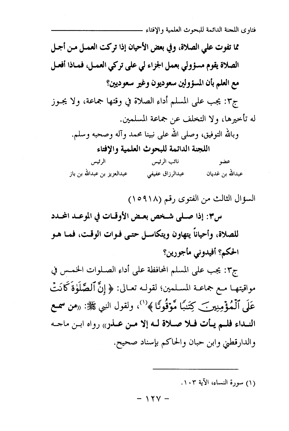 ج 3: يجب على المسلم المحافظة على أداء الصلوات الخمس في مواقيتها مع جماعة المسلمين؛ لقوله تعالى: {إِنَّ الصَّلَاةَ كَانَتْ عَلَى الْمُؤْمِنِينَ كِتَابًا مَوْقُوتًا} (¬1) ولقول النبي صلى الله عليه وسلم: «من سمع النداء فلم يأت فلا صلاة له إلا من عذر (¬2) » رواه ابن ماجه والدارقطني وابن حبان والحاكم بإسناد صحيح.