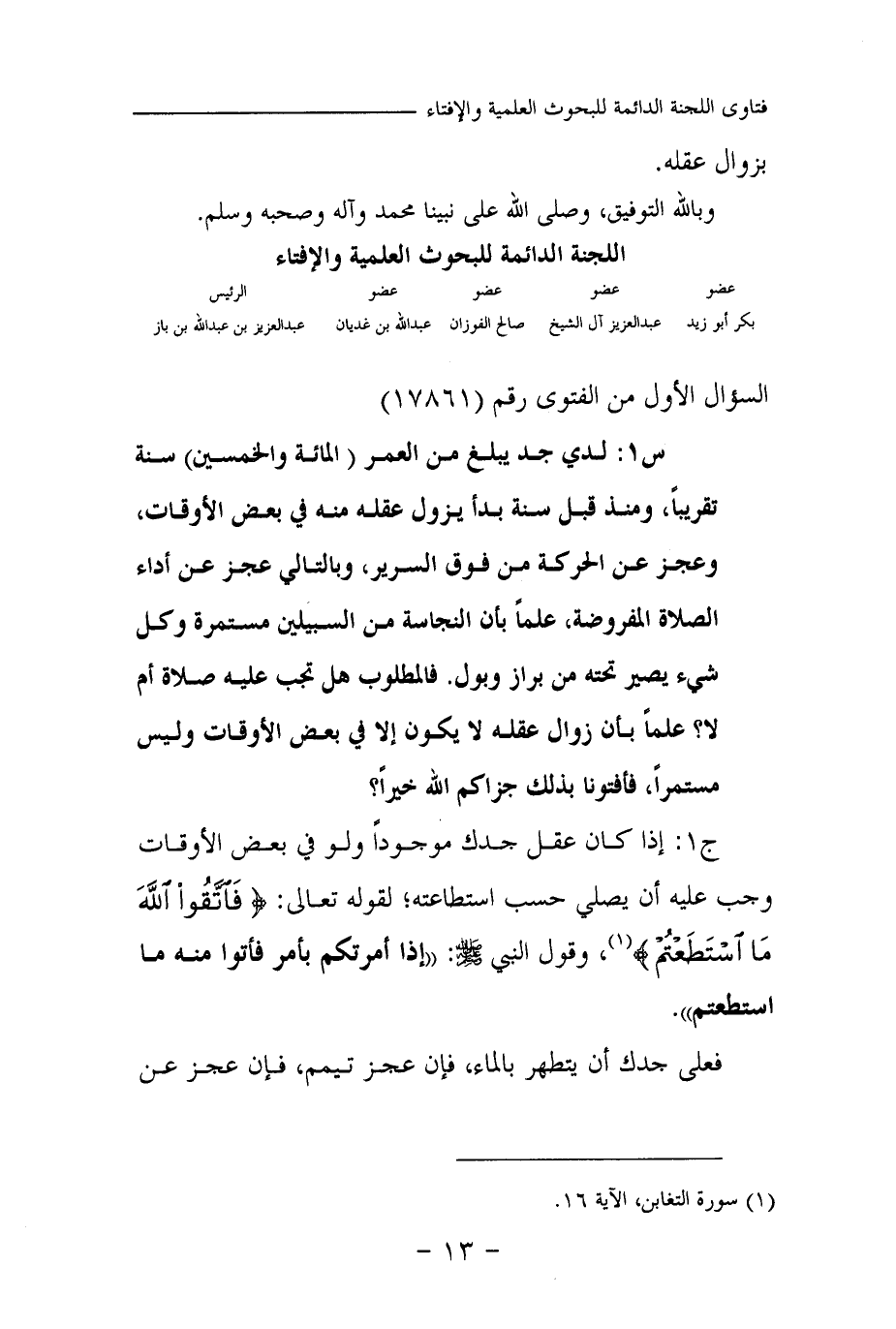 س 1: لدي جد يبلغ من العمر (المائة والخمسين) سنة تقريبا، ومنذ قبل سنة بدأ يزول عقله منه في بعض الأوقات، وعجز عن الحركة من فوق السرير، وبالتالي عجز عن أداء الصلاة المفروضة، علما بأن النجاسة من السبيلين مستمرة، وكل شيء يصير تحته من براز وبول فالمطلوب هل تجب عليه صلاة أم لا؟ علما بأن زوال عقله لا يكون إلا في بعض الأوقات وليس مستمرا، فأفتونا بذلك جزاكم الله خيرا؟
