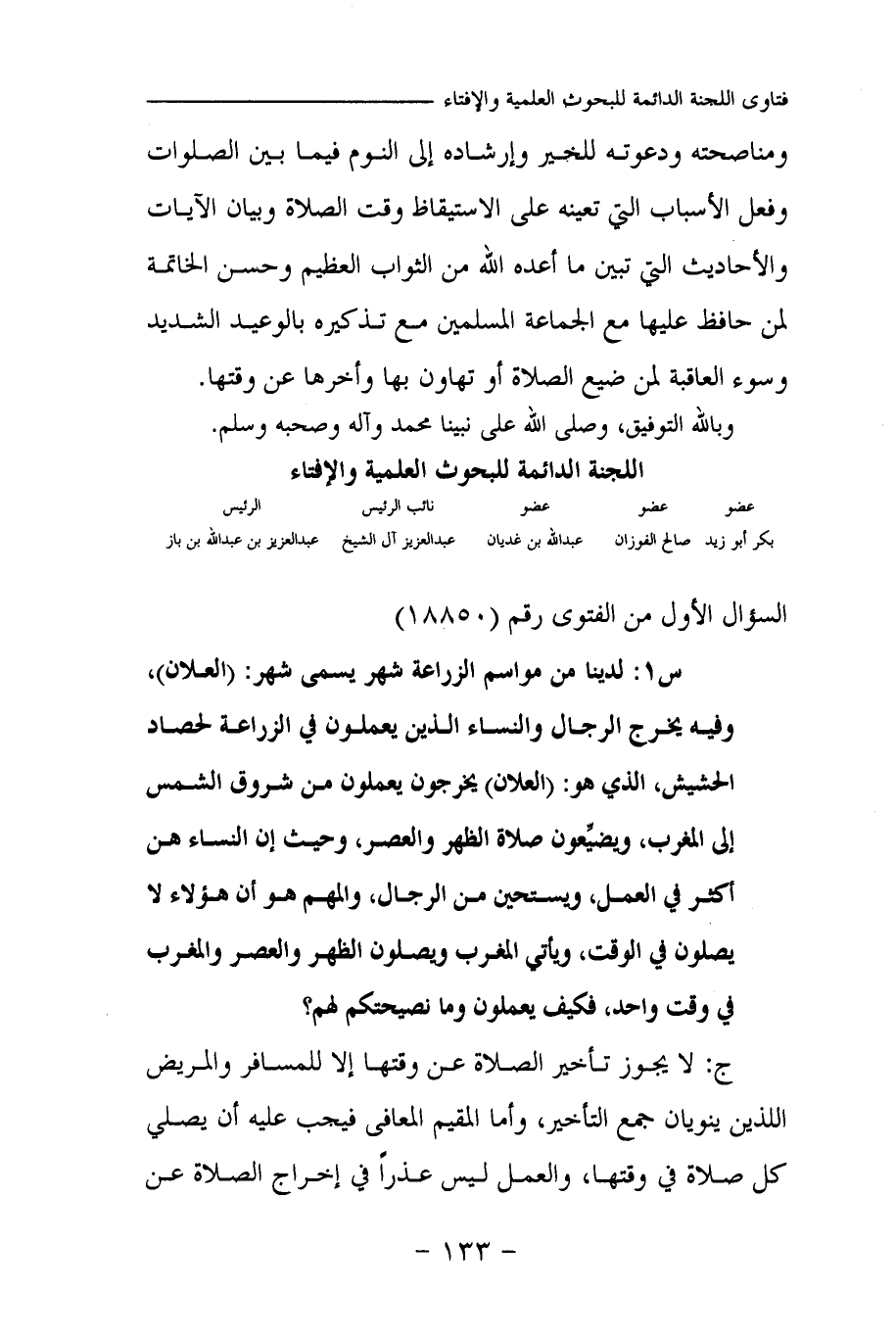 س 1: لدينا من مواسم الزراعة شهر يسمى شهر: (العلان) ، وفيه يخرج الرجال والنساء الذين يعملون في الزراعة لحصاد الحشيش، الذي هو: (العلان) يخرجون يعملون من شروق الشمس إلى المغرب، ويضيعون صلاة الظهر والعصر، وحيث إن النساء هن أكثر في العمل، ويستحين من الرجال، والمهم هو أن هؤلاء لا يصلون في الوقت، ويأتي المغرب ويصلون الظهر والعصر والمغرب في وقت واحد، فكيف يعملون وما نصيحتكم لهم؟