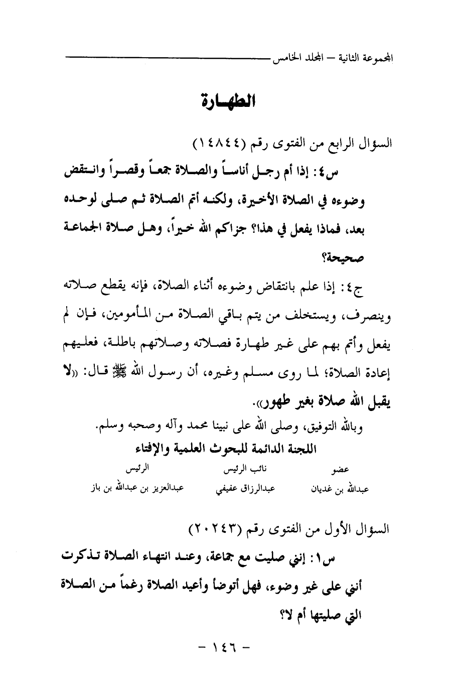 س 4: إذا أم رجل أناسا والصلاة جمعا وقصرا وانتقض وضوءه في الصلاة الأخيرة، ولكنه أتم الصلاة ثم صلى لوحده بعد، فماذا يفعل في هذا؟ جزاكم الله خيرا، وهل صلاة الجماعة صحيحة؟