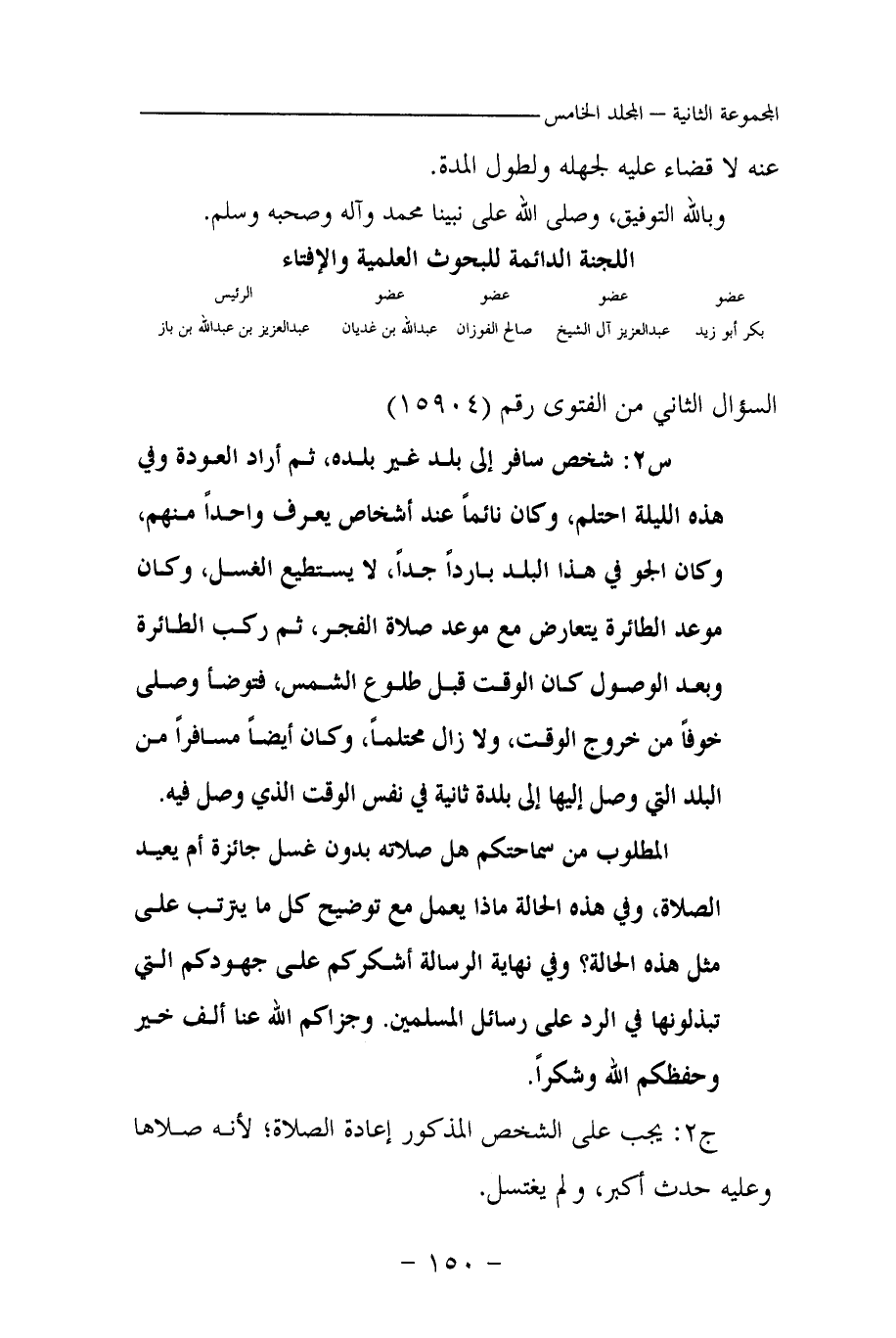 س 2: شخص سافر إلى بلد غير بلده، ثم أراد العودة وفي هذه الليلة احتلم، وكان نائما عند أشخاص يعرف واحدا منهم، وكان الجو في هذا البلد باردا جدا، لا يستطيع الغسل، وكان موعد الطائرة يتعارض مع موعد صلاة الفجر، ثم ركب الطائرة وبعد الوصول كان الوقت قبل طلوع الشمس، فتوضأ وصلى خوفا من خروج الوقت، ولا زال محتلما، وكان أيضا مسافرا من البلد التي وصل إليها إلى بلدة ثانية في نفس الوقت الذي وصل فيه.