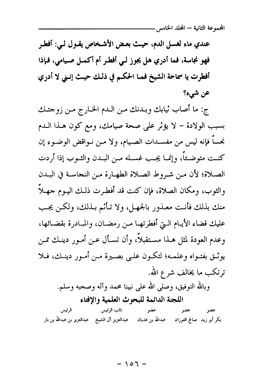 ج: ما أصاب ثيابك وبدنك من الدم الخارج من زوجتك بسبب الولادة - لا يؤثر على صحة صيامك، ومع كون هذا الدم نجسا، فإنه ليس من مفسدات الصيام، ولا من نواقض الوضوء إن كنت متوضئا، وإنما يجب غسله من البدن والثوب إذا أردت الصلاة؛ لأن من شروط الصلاة الطهارة من النجاسة في البدن والثوب، ومكان الصلاة، فإن كنت قد أفطرت ذلك اليوم جهلا منك بذلك فأنت معذور بالجهل، ولا تأثم بذلك، ولكن يجب عليك قضاء الأيام التي أفطرتها من رمضان، والمبادرة بقضائها، وعدم العودة لمثل هذا مستقبلا، وأن تسأل عن أمور دينك ممن يوثق بفتواه وعلمه؛ لتكون على بصيرة من أمور دينك، فلا ترتكب ما يخالف شرع الله.