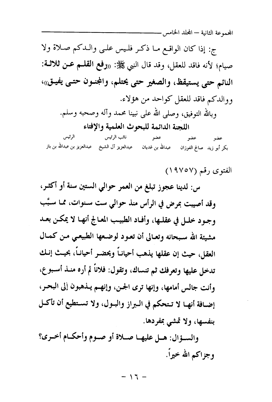 ج: إذا كان الواقع ما ذكر فليس على والدكم صلاة ولا صيام؛ لأنه فاقد للعقل، وقد قال النبي صلى الله عليه وسلم: «رفع القلم عن ثلاثة: النائم حتى يستيقظ، والصغير حتى يحتلم، والمجنون حتى يفيق (¬1) » ، ووالدكم فاقد للعقل كواحد من هؤلاء.